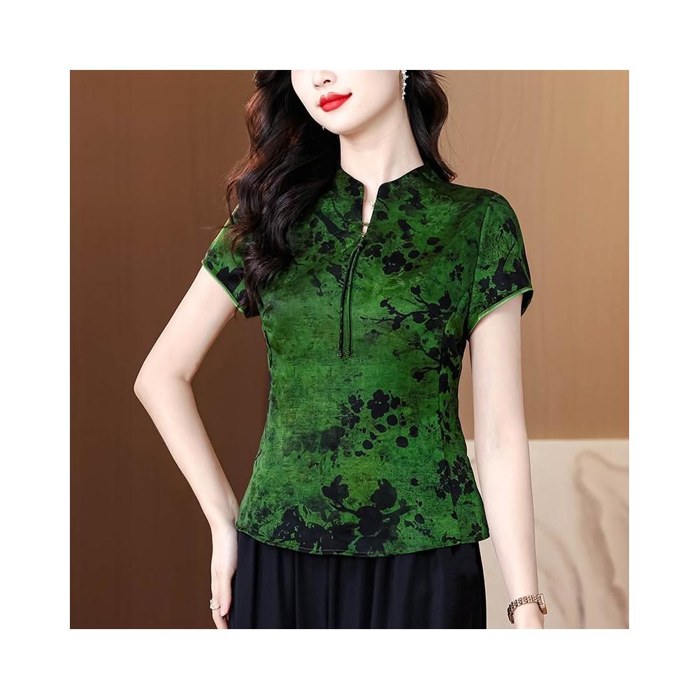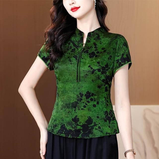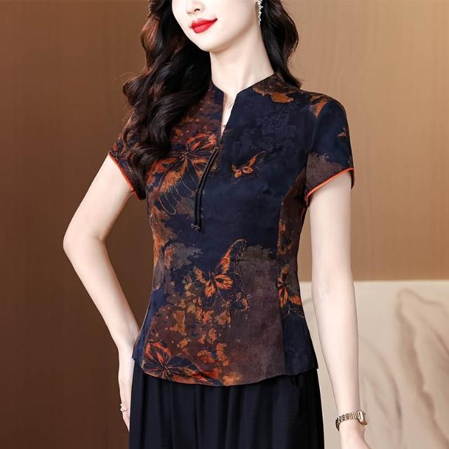 新款夏季短袖 香雲紗上衣女2025款短袖印花新中式媽媽裝桑蠶絲真絲小衫 比比優