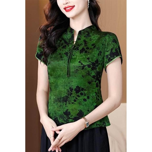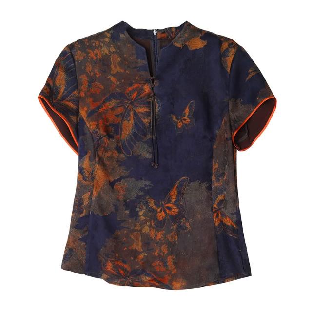 新款夏季短袖 香雲紗上衣女2025款短袖印花新中式媽媽裝桑蠶絲真絲小衫 比比優