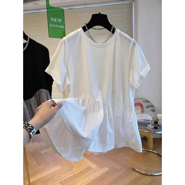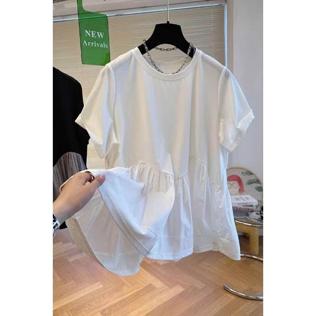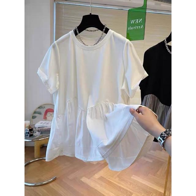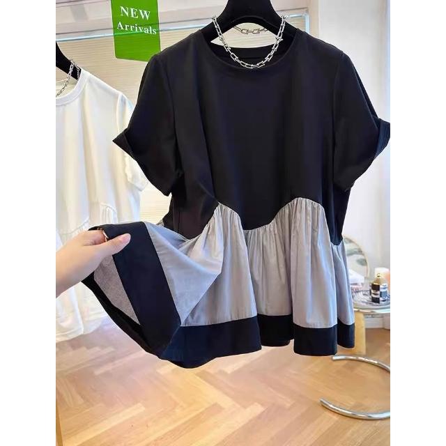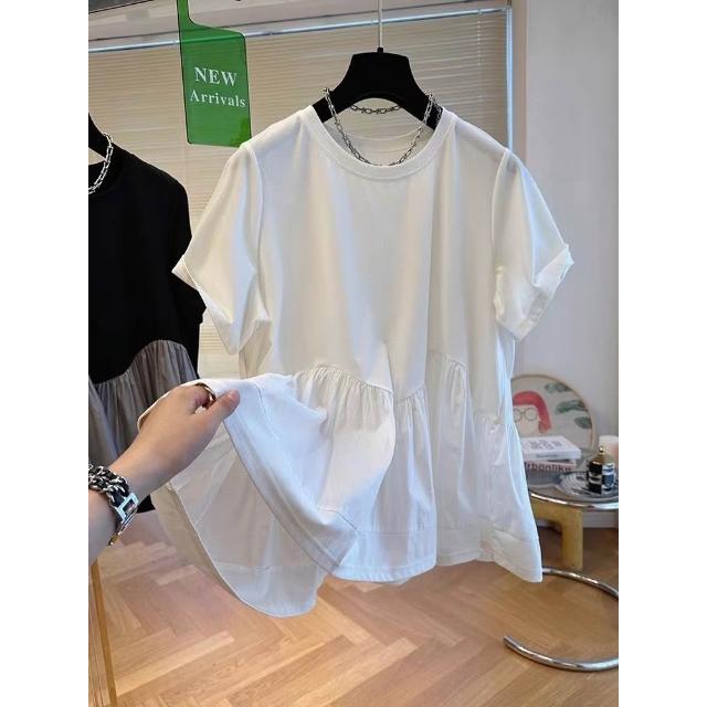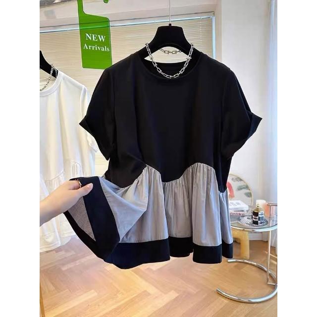 新款夏季短袖 小眾設計感下擺蓬蓬t恤拼接娃娃衫上衣女短袖寬松休閑2024新款夏 比比優