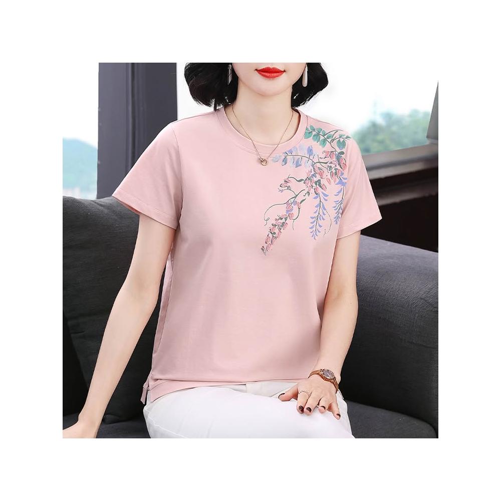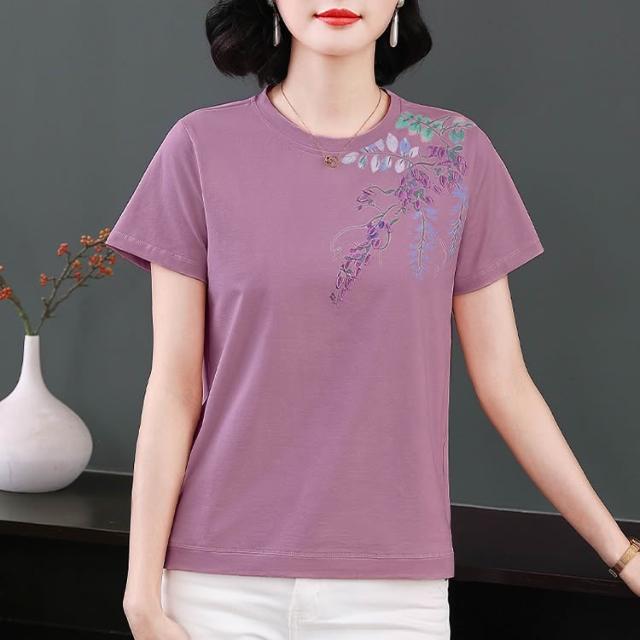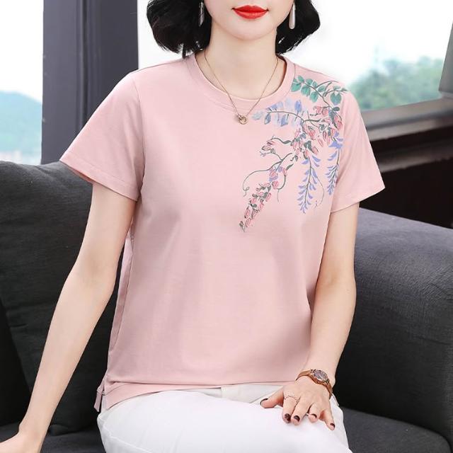 新款夏季短袖 夏季印花刺繡T恤新款媽媽裝短袖女高級感小眾設計寬松顯瘦上衣女 比比優