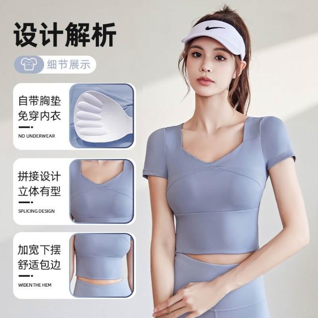 短款露臍速幹可拆卸胸墊瑜伽服 運動T恤 瑜伽服 運動短袖 跑步緊身裸感透氣健身瑜伽T恤