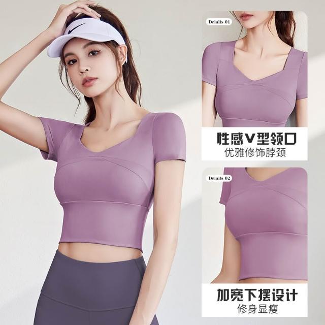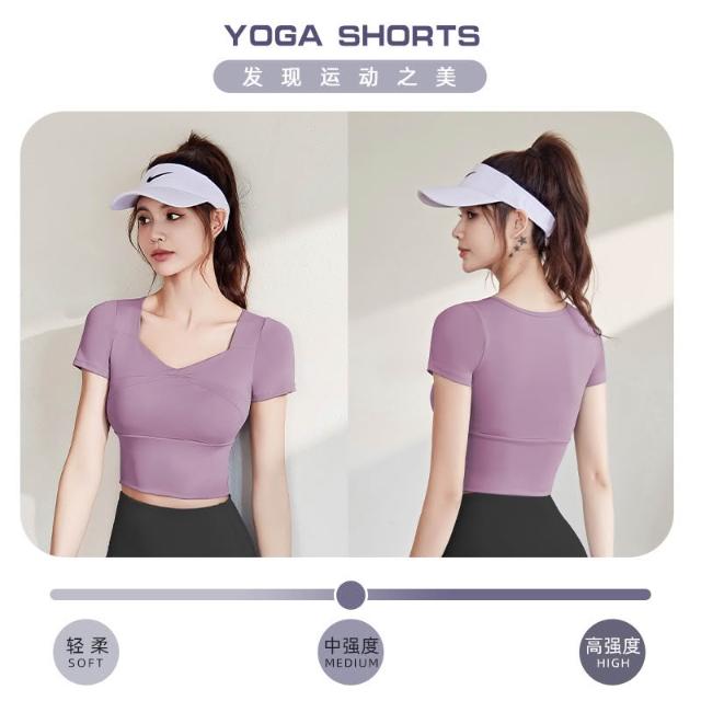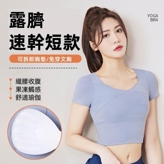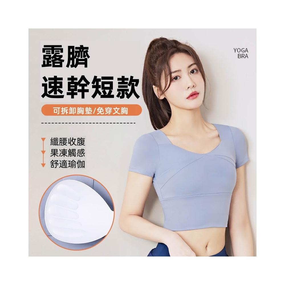 短款露臍速幹可拆卸胸墊瑜伽服 運動T恤 瑜伽服 運動短袖 跑步緊身裸感透氣健身瑜伽T恤