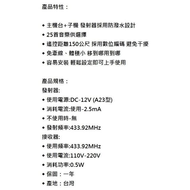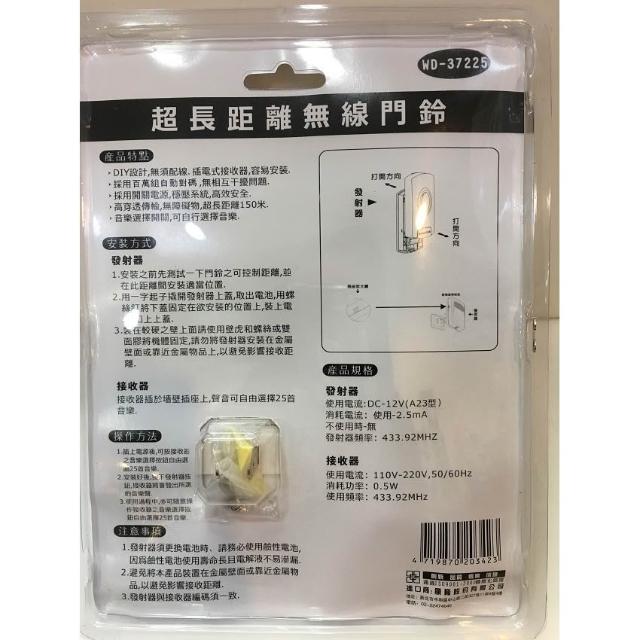 顯隆 插電式 長距離無線門鈴 子母 呼叫鈴 看護鈴(WD-37225)