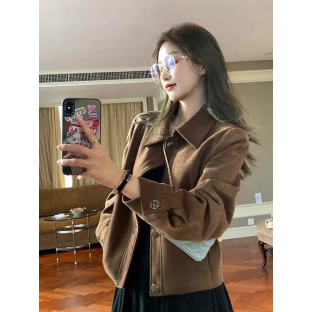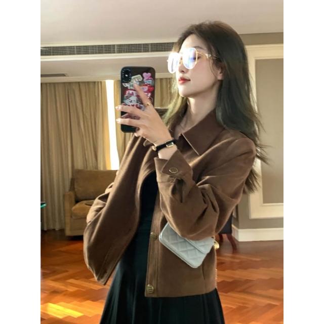 OOTD全尺碼咖色鹿皮絨外套女 夾克上衣 短款外套 飛行服 韓系寬松 美拉德 休閑外套 美式復古機車服 小個子外套