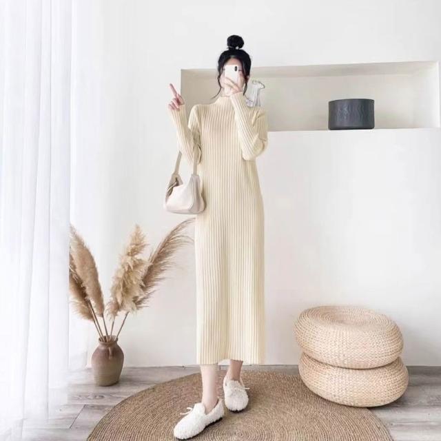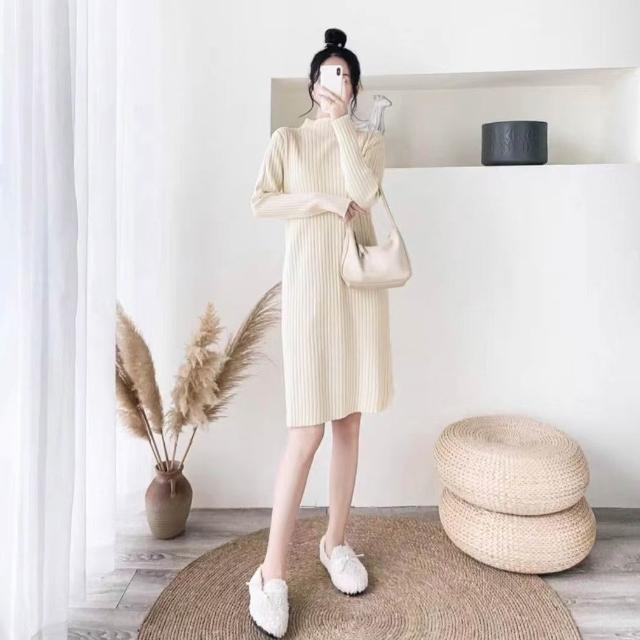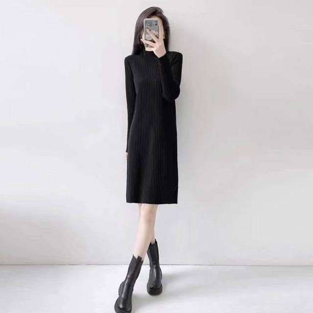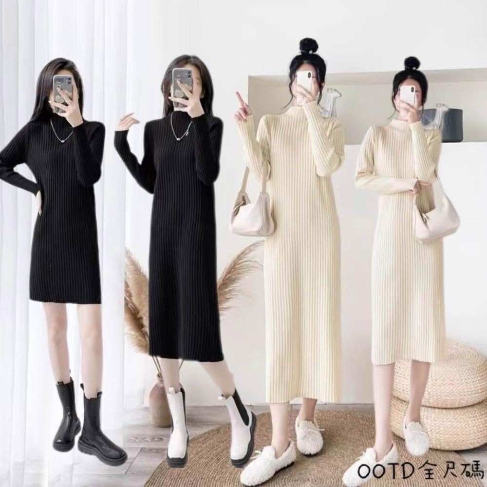 OOTD全尺碼針織連衣裙 洋裝 半高領連身裙 長袖打底衫 過膝長裙 中長款毛衣裙 顯瘦時尚洋氣裙子 直筒裙