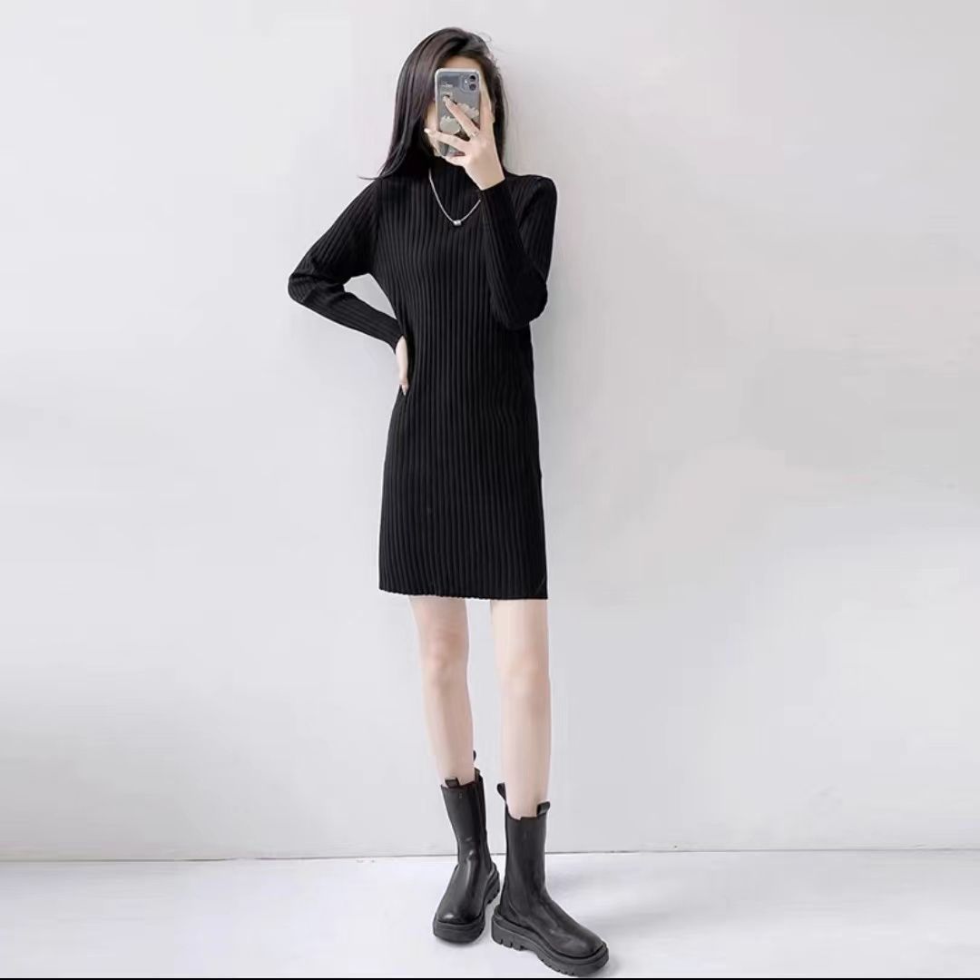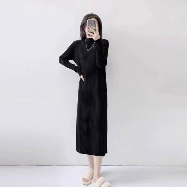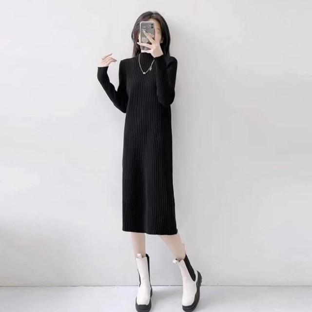 OOTD全尺碼針織連衣裙 洋裝 半高領連身裙 長袖打底衫 過膝長裙 中長款毛衣裙 顯瘦時尚洋氣裙子 直筒裙