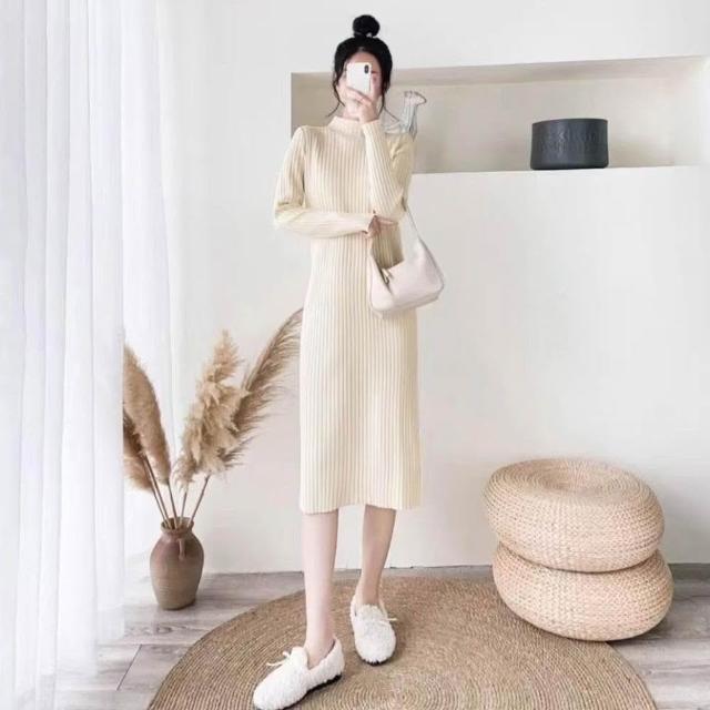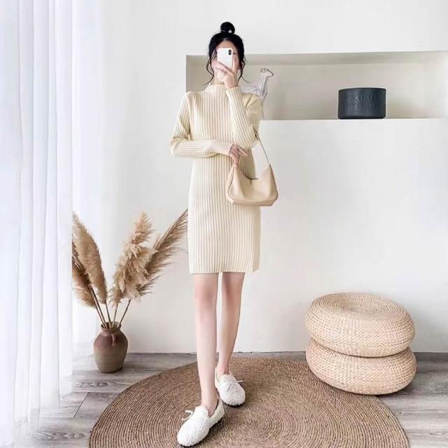 OOTD全尺碼針織連衣裙 洋裝 半高領連身裙 長袖打底衫 過膝長裙 中長款毛衣裙 顯瘦時尚洋氣裙子 直筒裙
