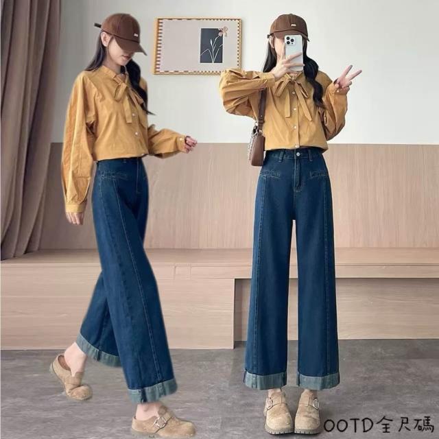 OOTD全尺碼直筒牛仔褲女 卷邊闊腿褲 復古藍牛仔褲 長褲 九分褲 寬褲 大碼女裝 下身 梨形身材 高腰顯瘦褲子