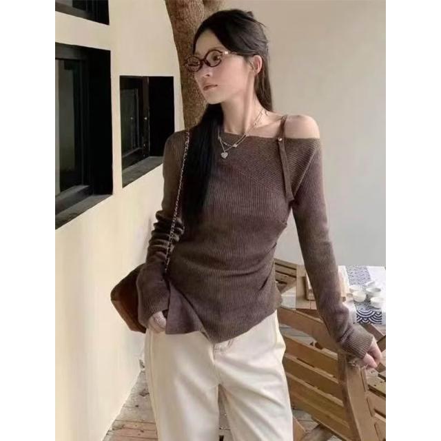 斜領針織衫 毛衣 露肩上衣 高級感 不規則開叉褶皺 純欲風 修身百搭 長袖針織衫 打底內搭上衣