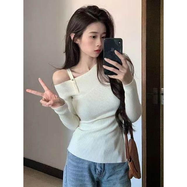 斜領針織衫 毛衣 露肩上衣 高級感 不規則開叉褶皺 純欲風 修身百搭 長袖針織衫 打底內搭上衣