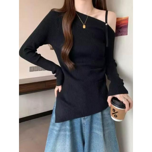 斜領針織衫 毛衣 露肩上衣 高級感 不規則開叉褶皺 純欲風 修身百搭 長袖針織衫 打底內搭上衣