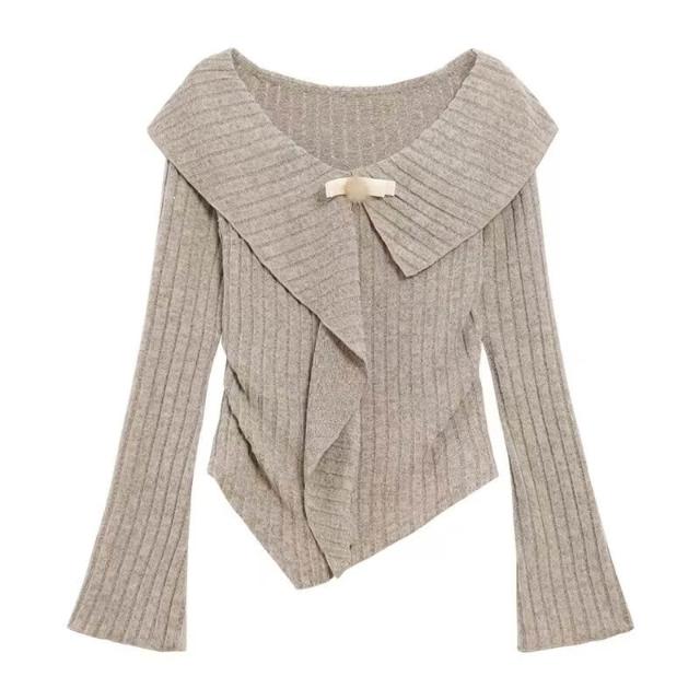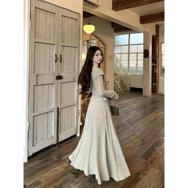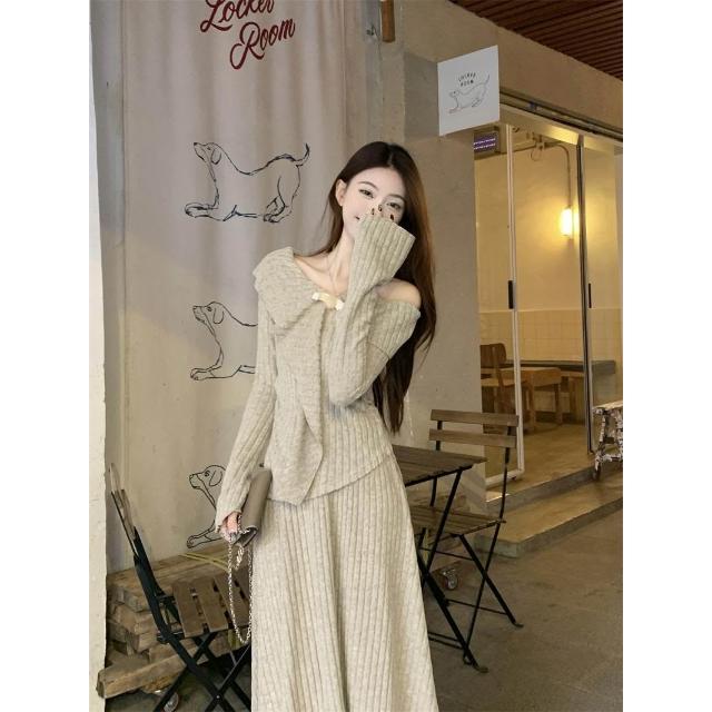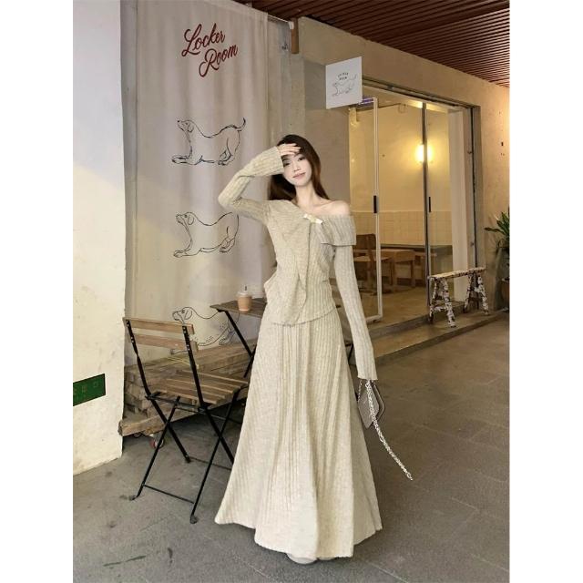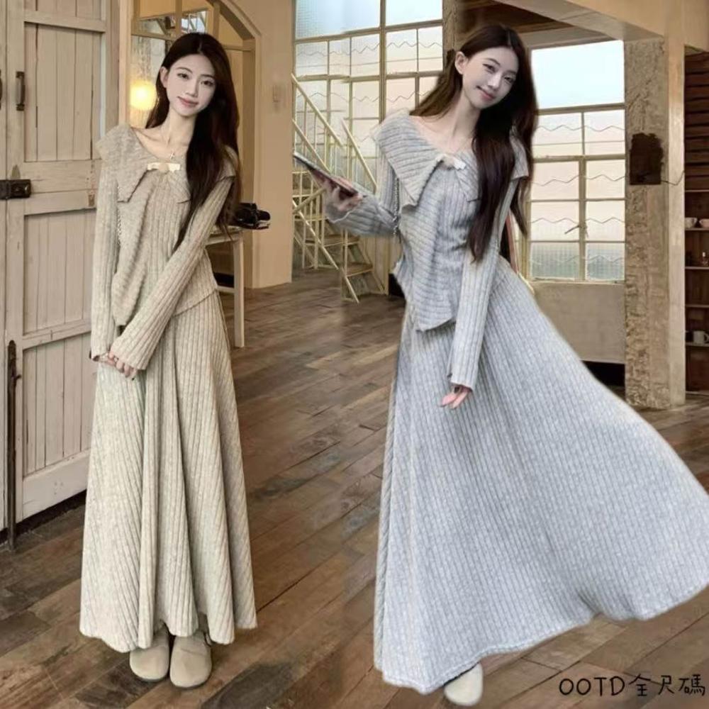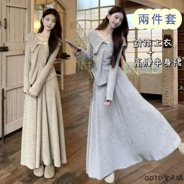 OOTD全尺碼法式套裝女 兩件套 不規則氣質針織上衣 高腰半身裙 春秋冬兩件套 高級感套裝 長袖上衣 長裙套裝