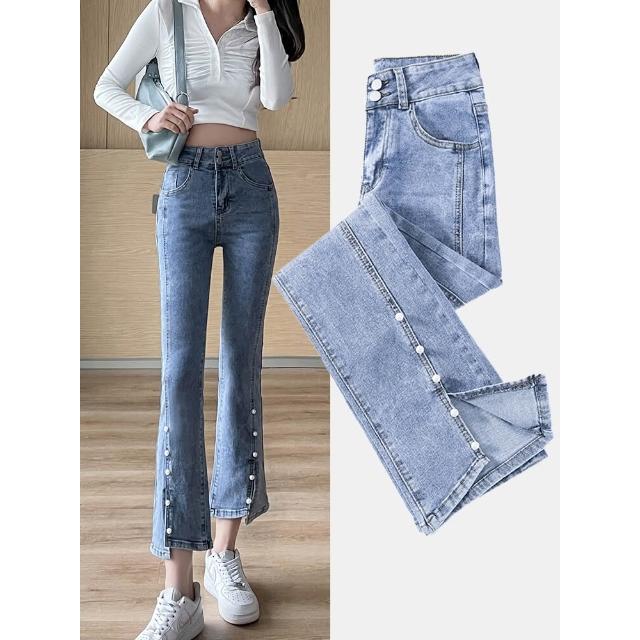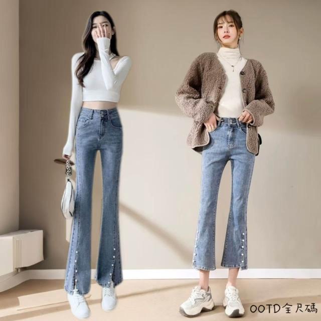 OOTD全尺碼牛仔褲女 港風復古 珍珠開叉微喇褲 九分褲 顯高顯瘦 小個子八分褲 直筒褲 闊腿褲 彈力高腰褲子
