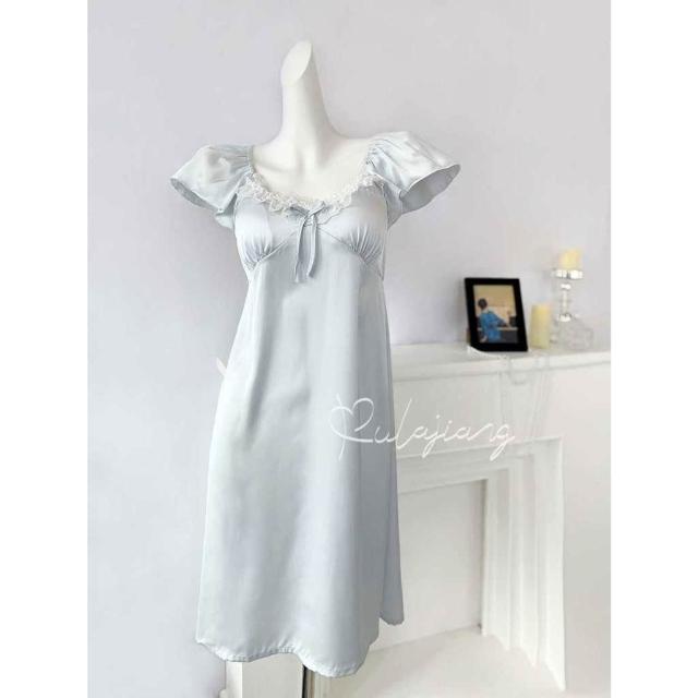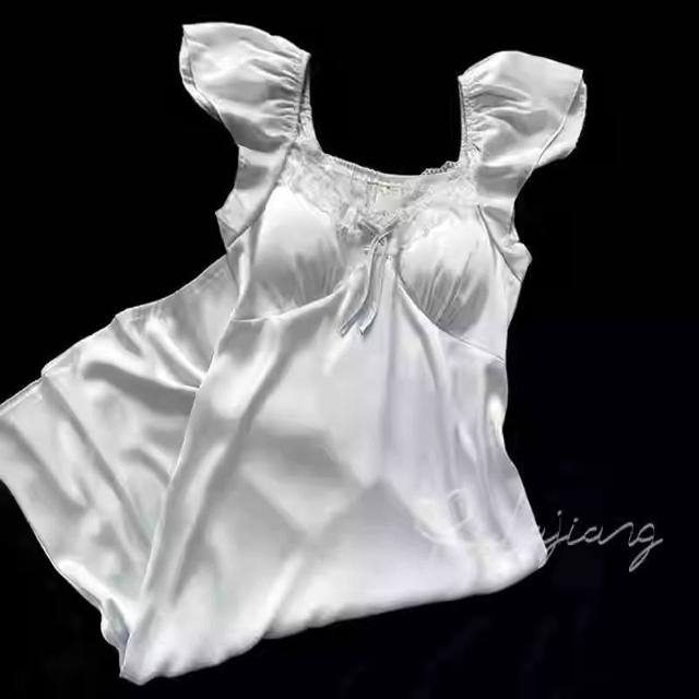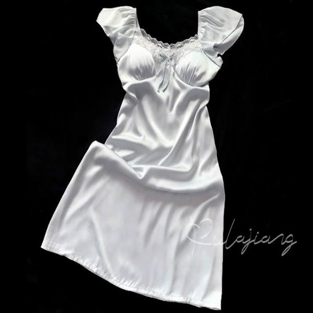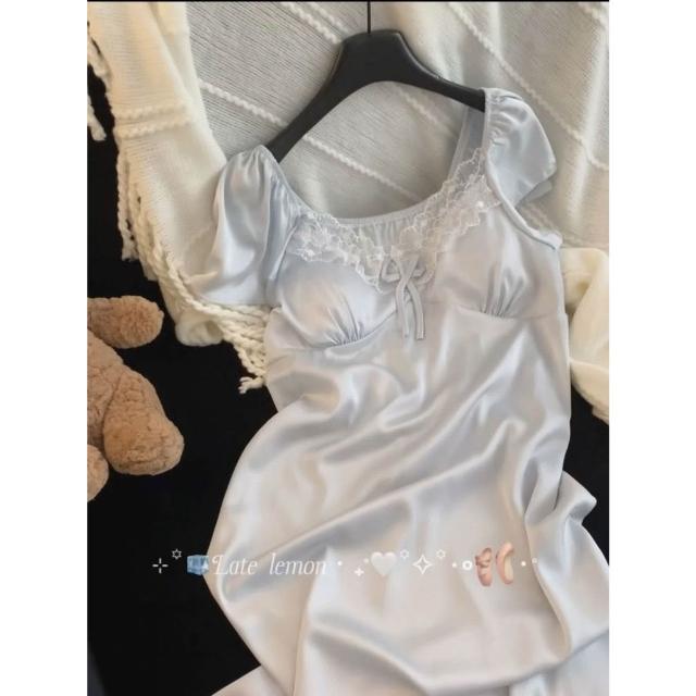 台灣現貨速發 帶胸墊睡衣 夏天女 2025新款冰絲薄款 吊帶短袖 甜美蕾絲睡裙 女家居服