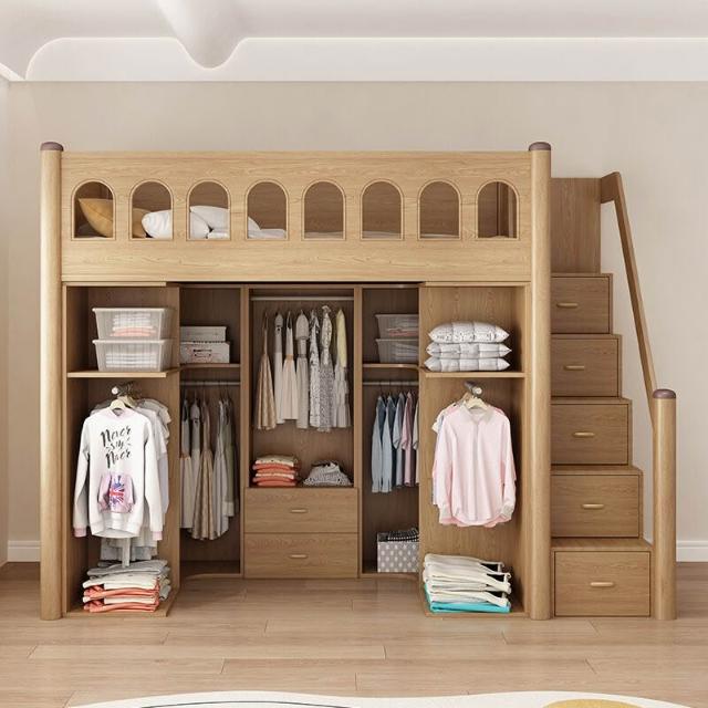 🍭實木上床下櫃床帶衣櫃一體高低床小戶型雙層步入式衣帽間組合