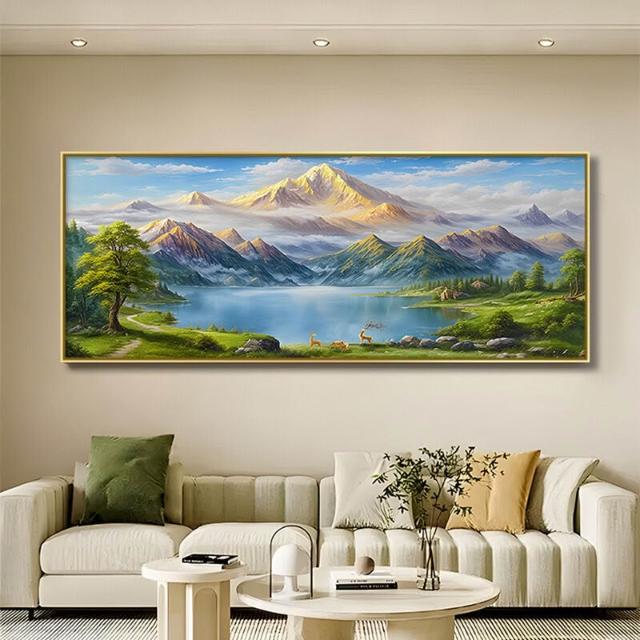 未晚家居館 橫版背靠金山聚財山水辦公室聚寶盆壁畫沙發背景墻裝飾畫風景掛畫