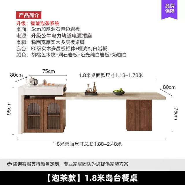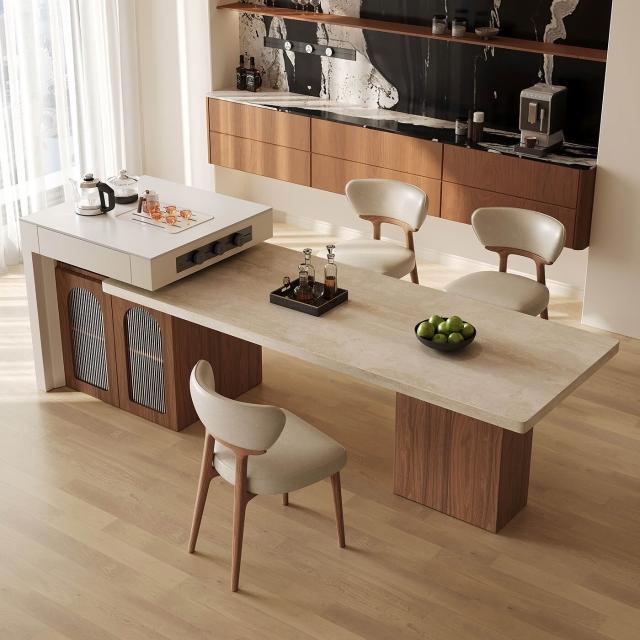 未晚家居館 中古風洞石巖板島臺餐桌一體家用可伸縮小戶型胡桃木色廚房中島臺