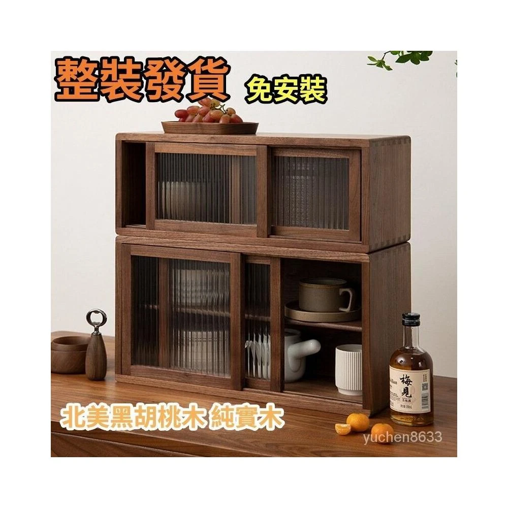 未晚家居館 高檔實木免安裝黑衚桃木輕奢複古廚房餐邊長虹玻璃櫃 桌上收納櫃 實木收納櫃 茶具收納櫃 桌上展示櫃 儲物櫃廚房 實木櫃