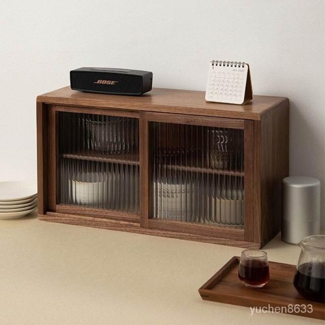 未晚家居館 高檔實木免安裝黑衚桃木輕奢複古廚房餐邊長虹玻璃櫃 桌上收納櫃 實木收納櫃 茶具收納櫃 桌上展示櫃 儲物櫃廚房 實木櫃