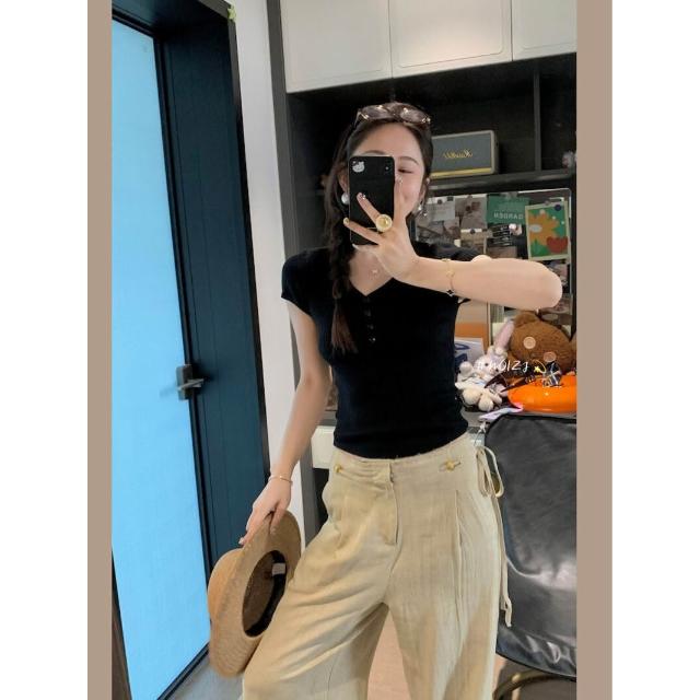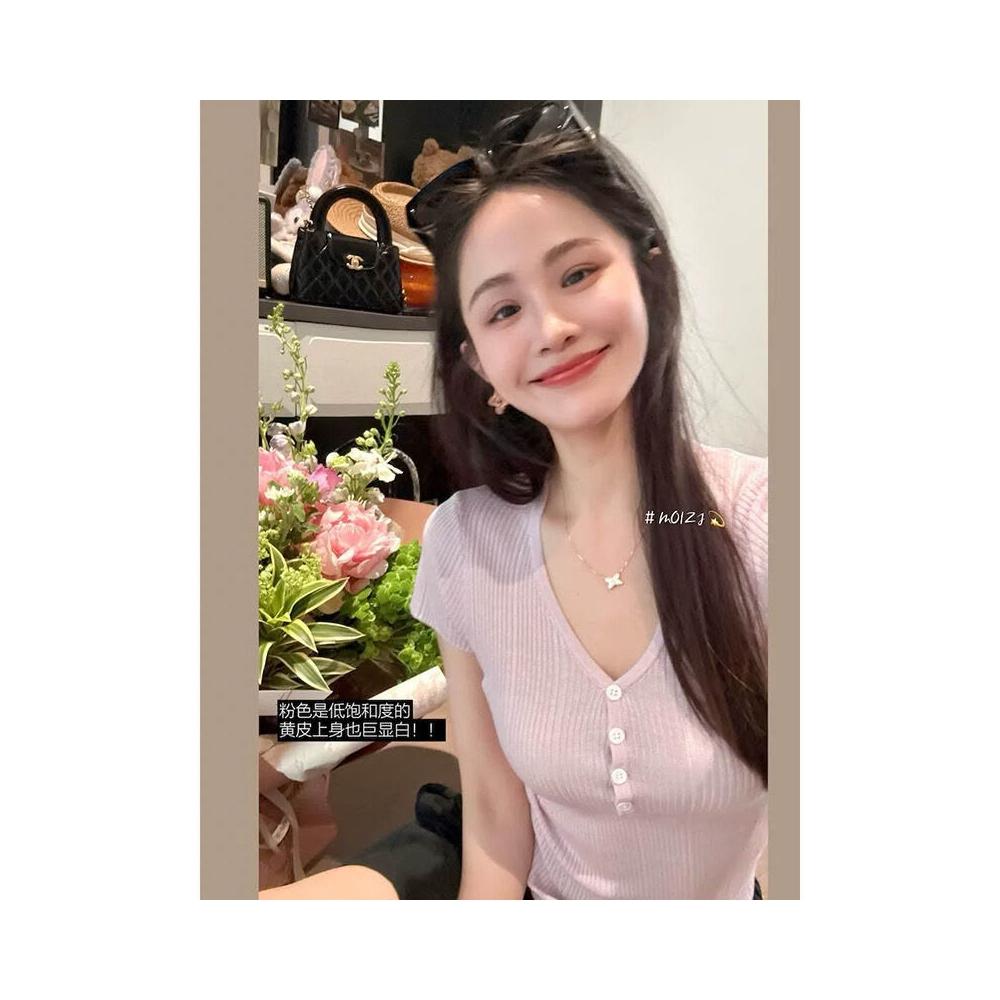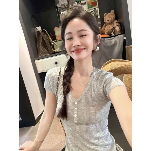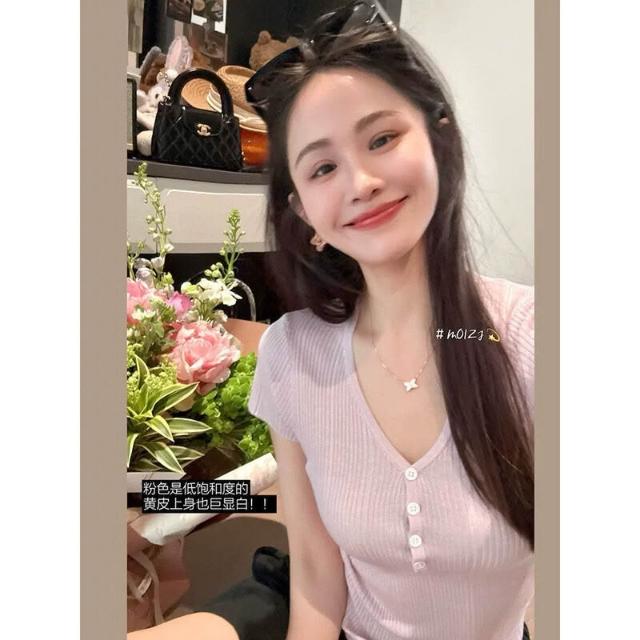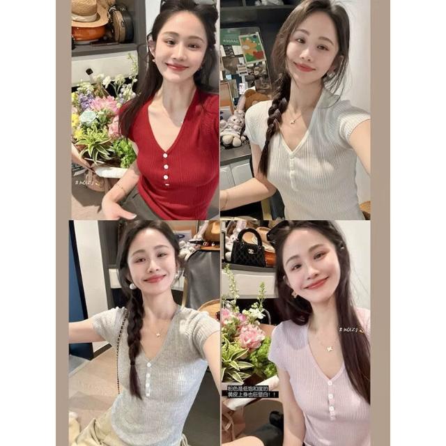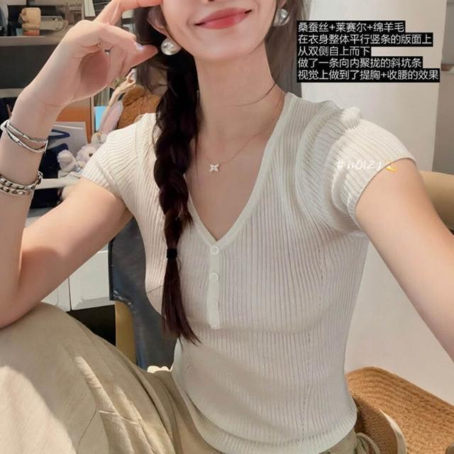 JU顯瘦 天絲羊毛蠶絲亨利短袖t恤女薄款V領針織衫彈力修身 0da