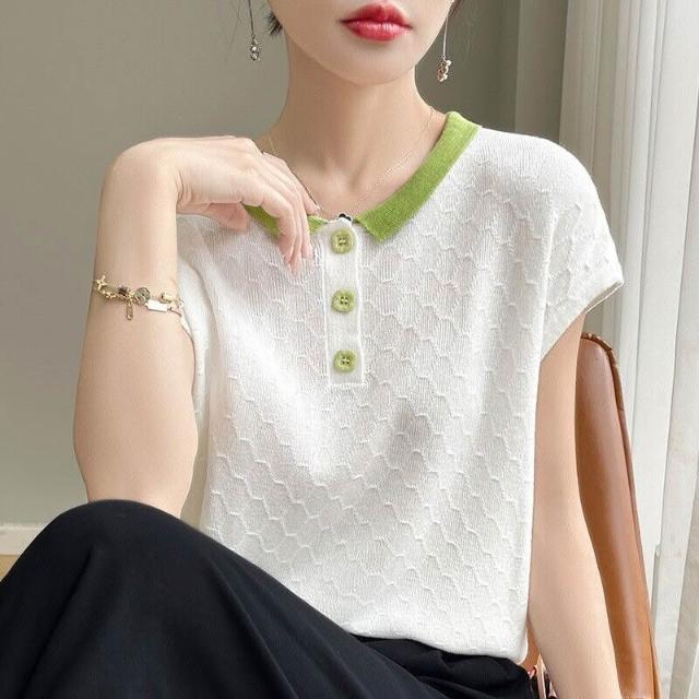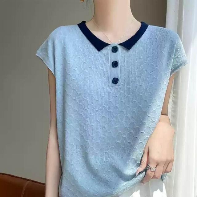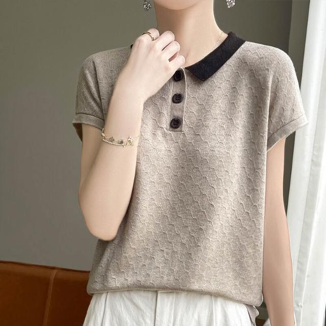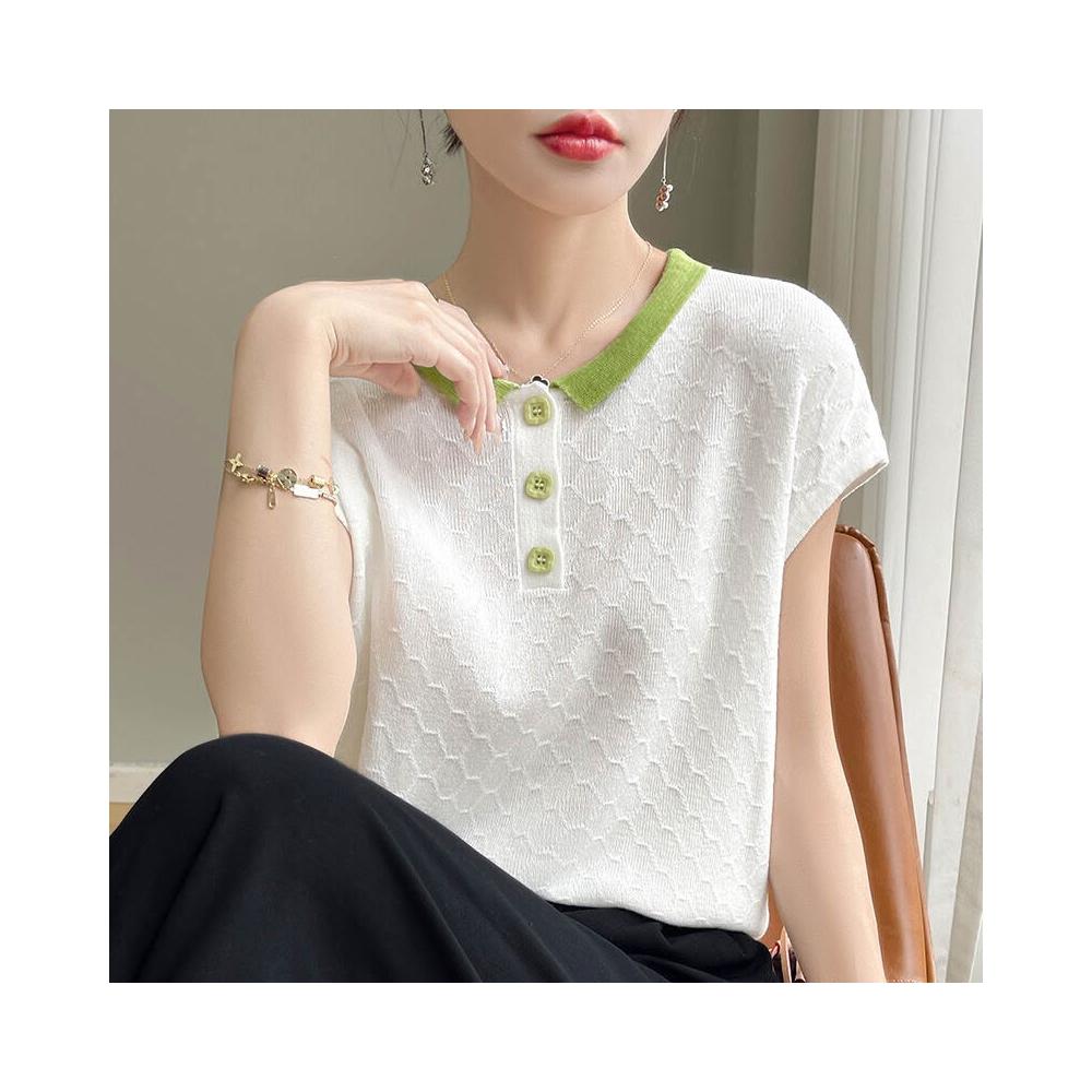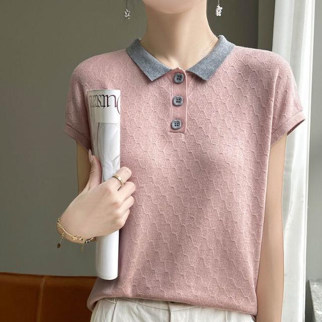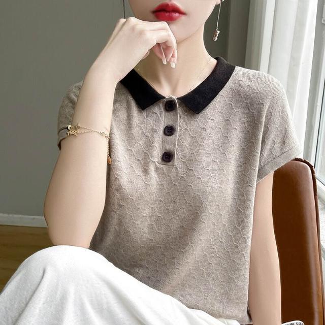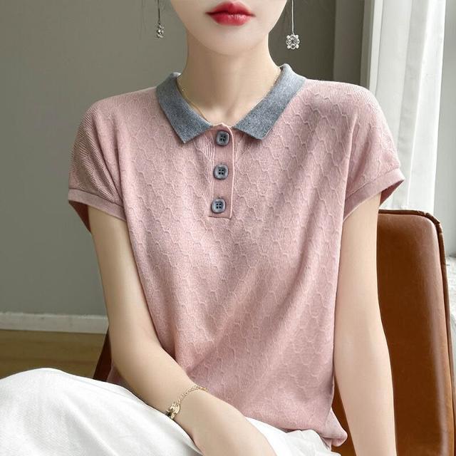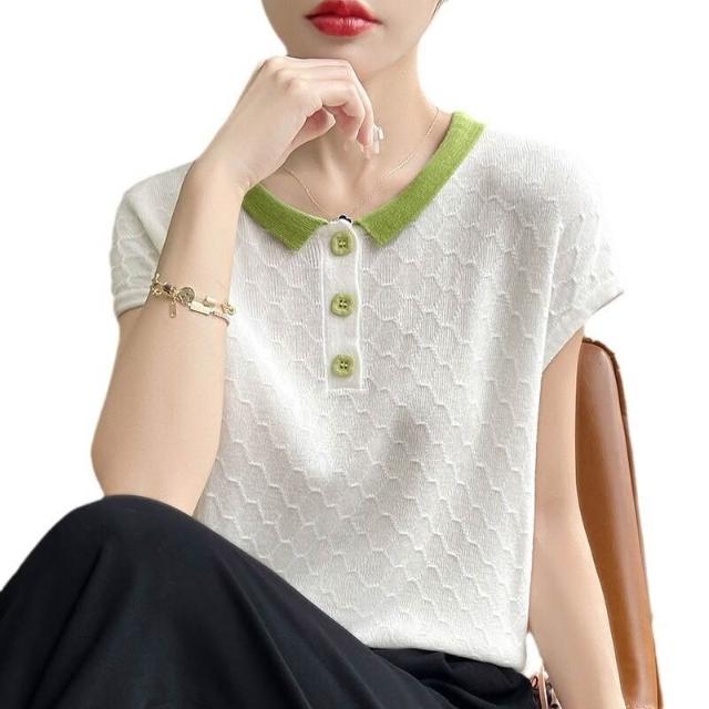法式小翻領針織短袖女POLO衫正肩撞色顯瘦T恤半袖天絲超好看上衣 e8a
