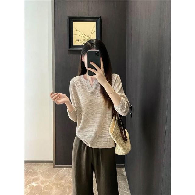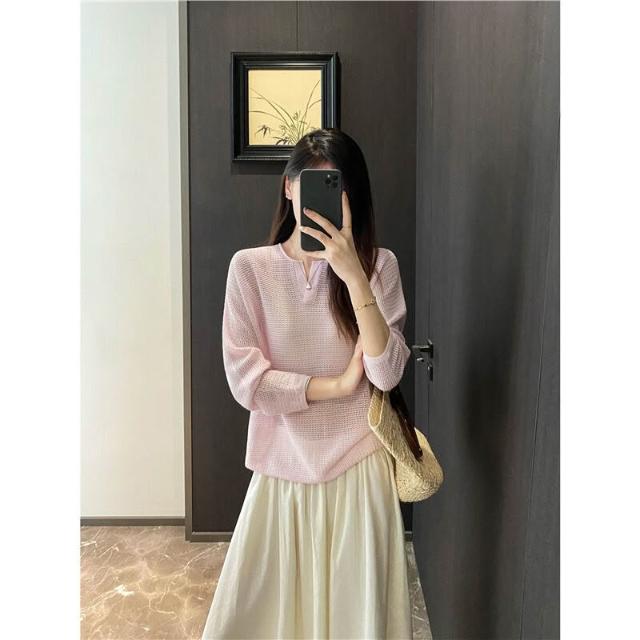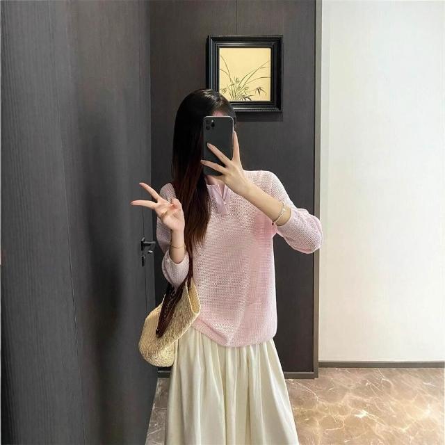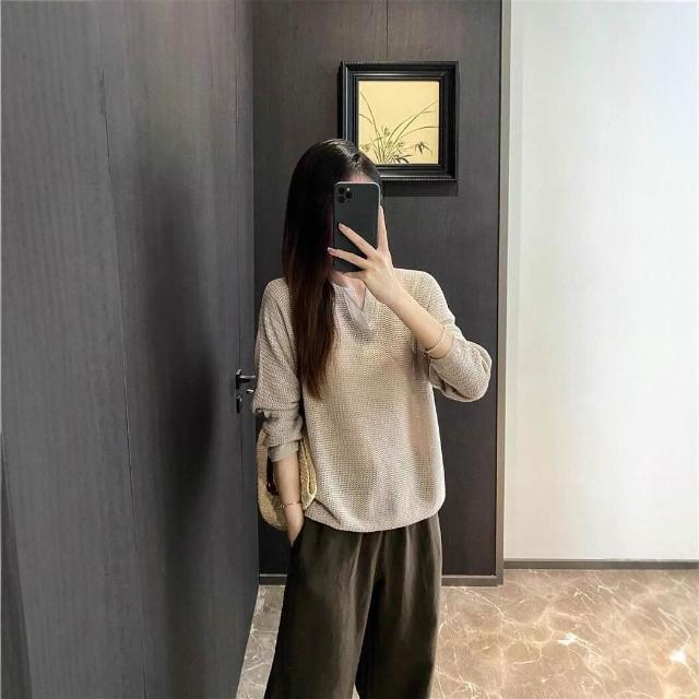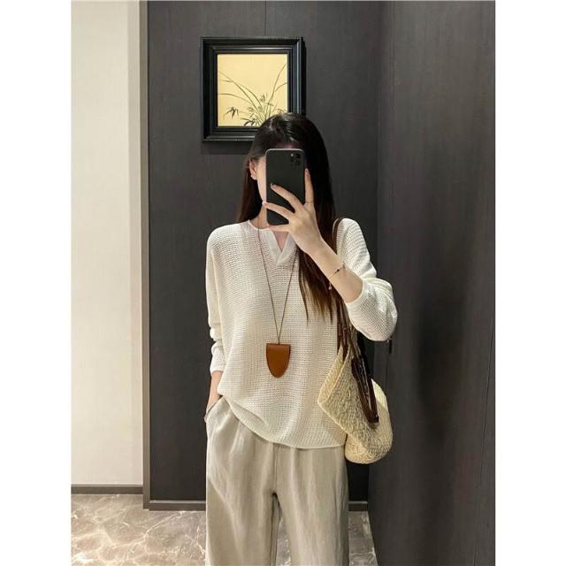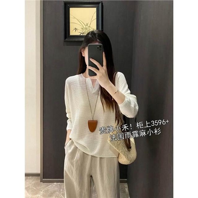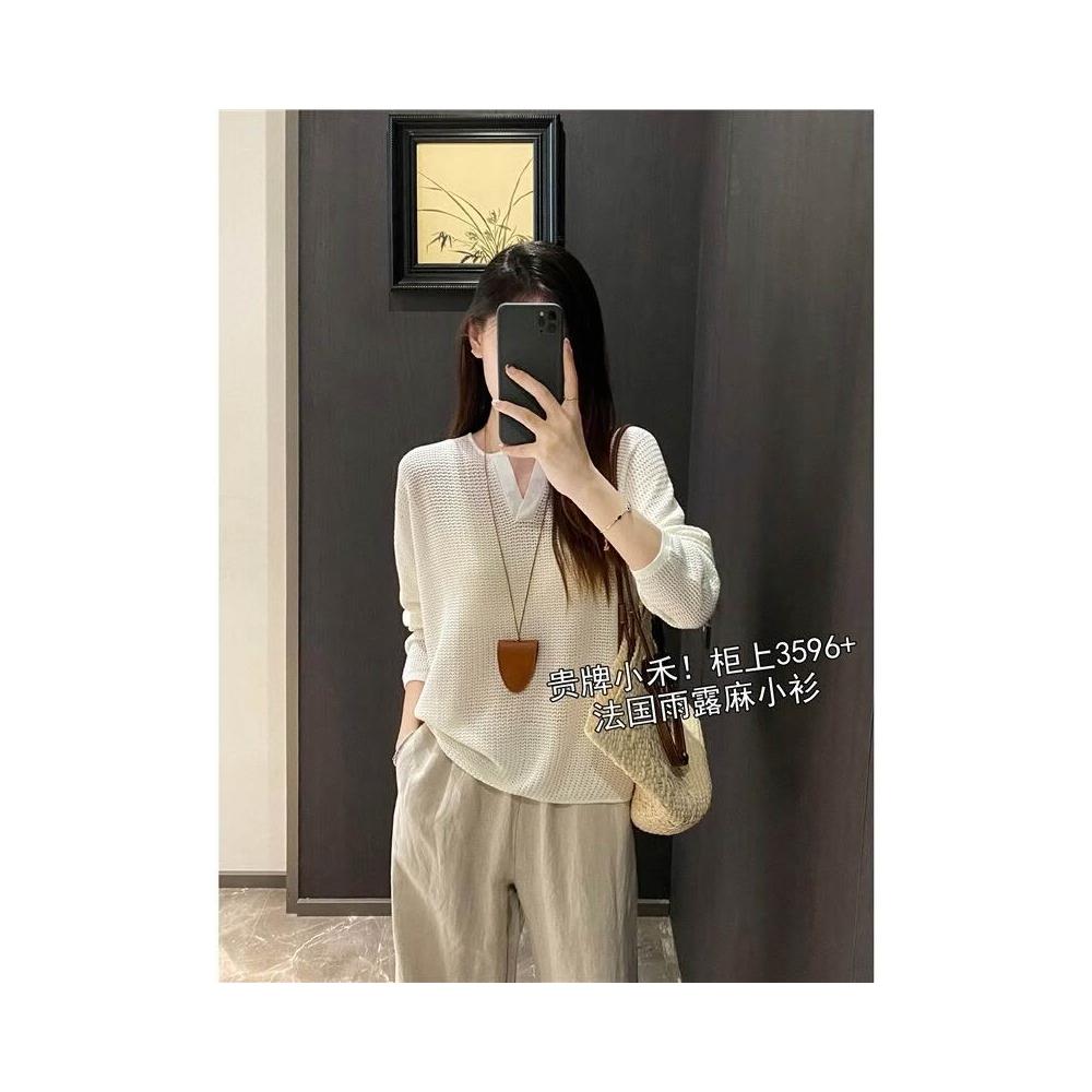 禾家雨露亞麻镂空針織衫薄款長袖防曬罩衫天絲萊賽爾小衫上衣女秋 61c