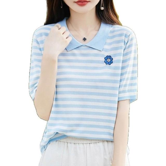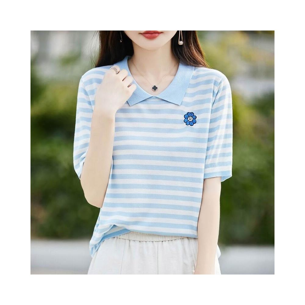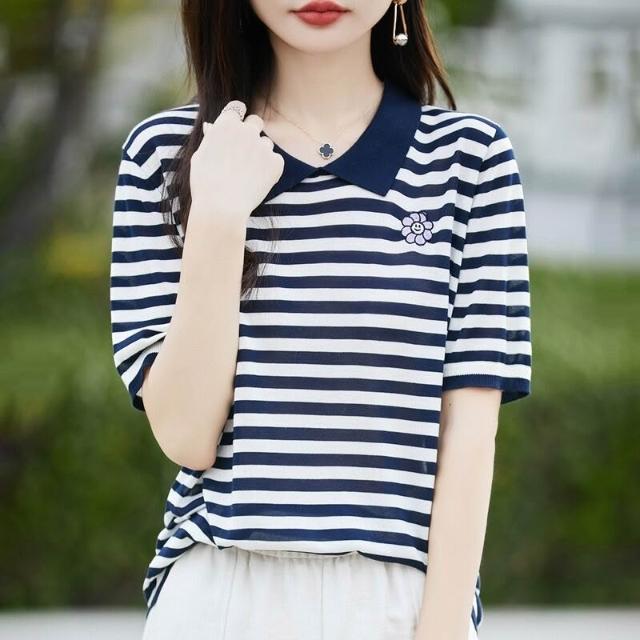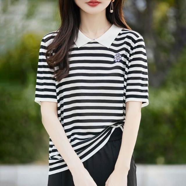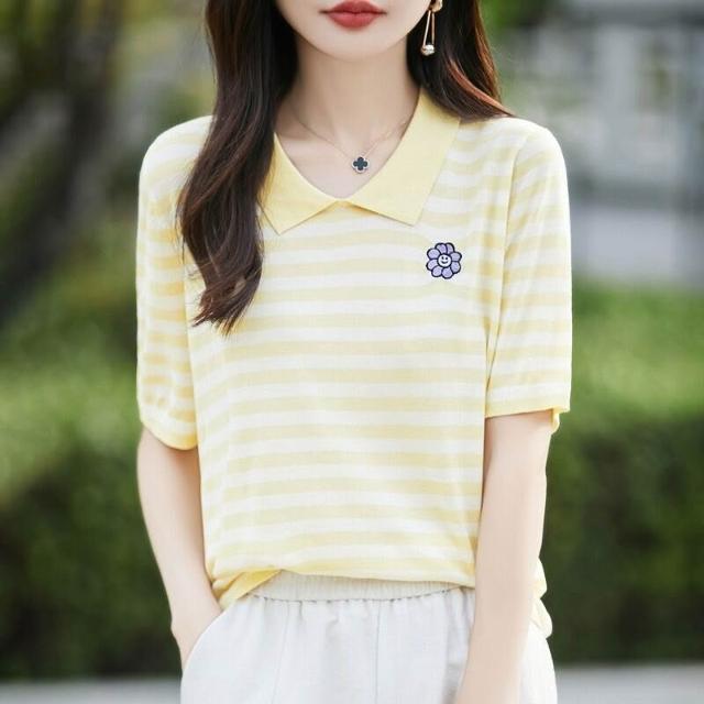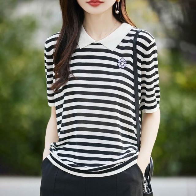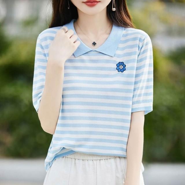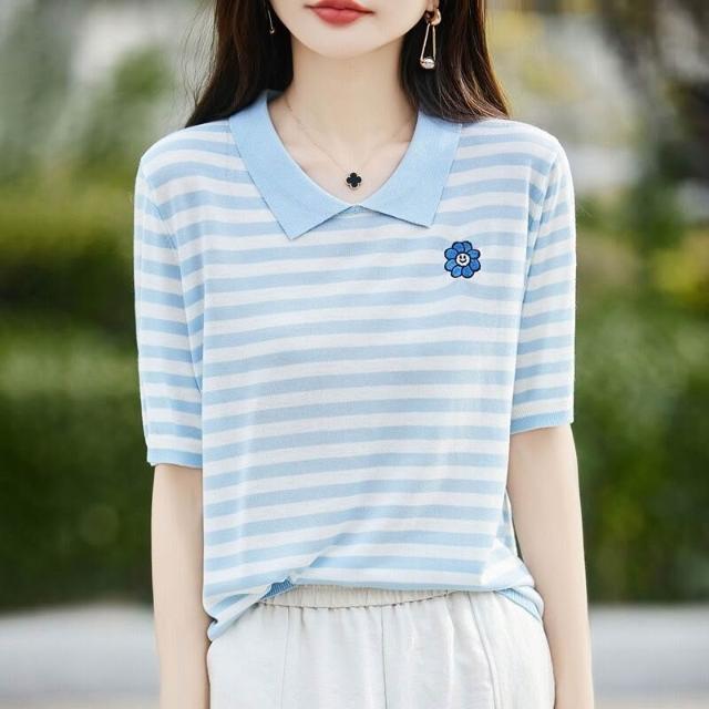 夏季衣服娃娃領天絲條紋針織短袖T恤女正肩薄款萊賽爾襯衫上衣 129