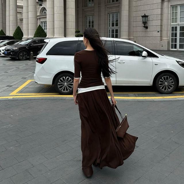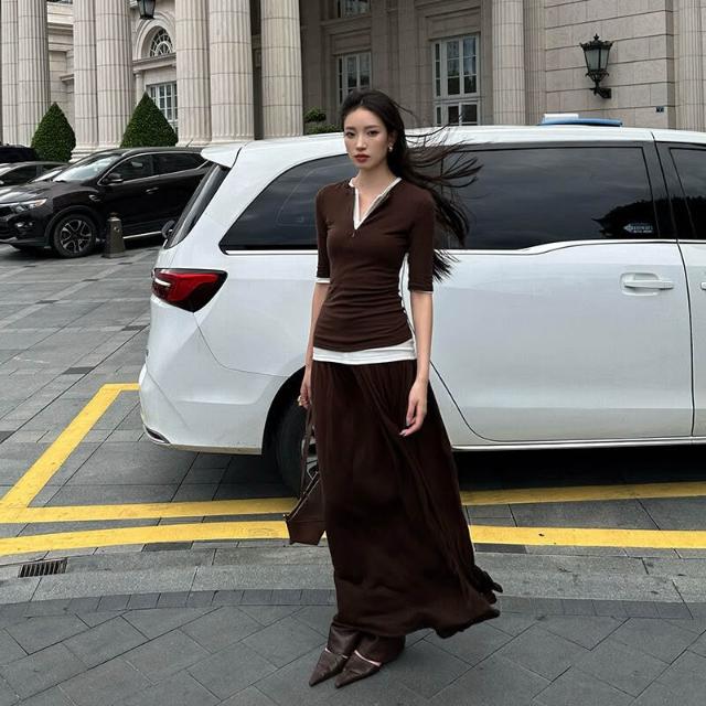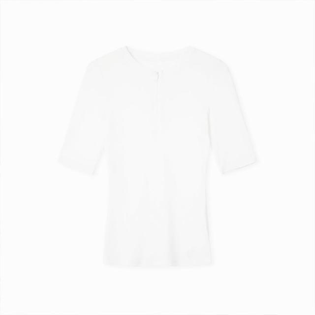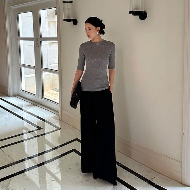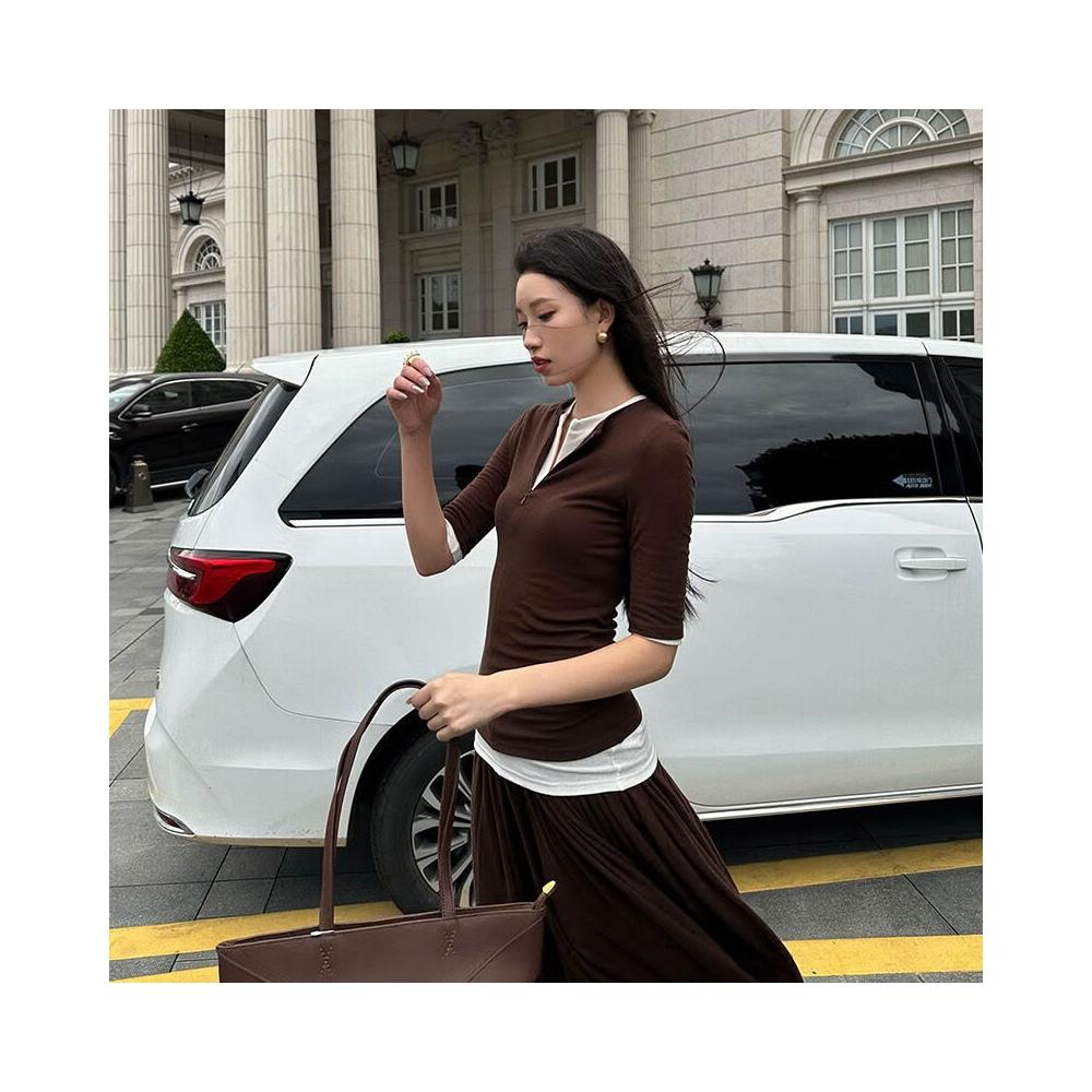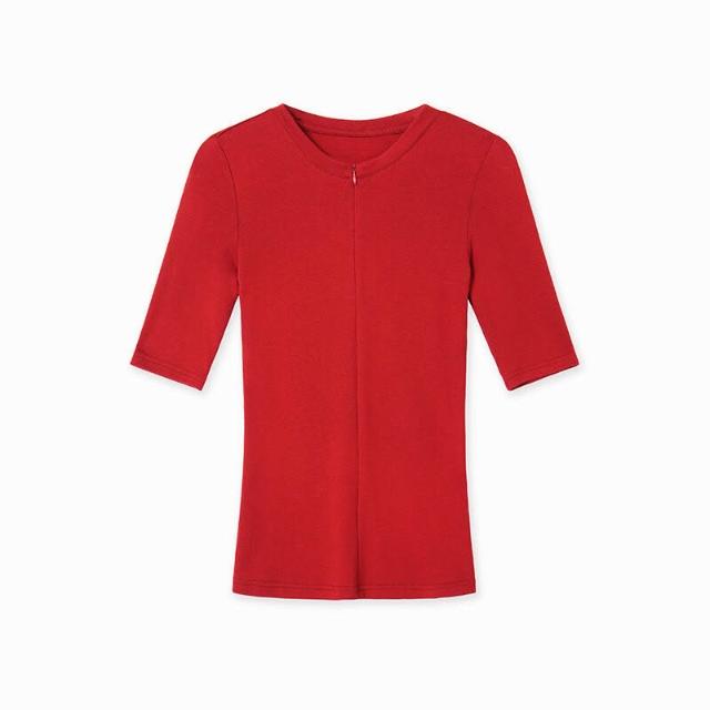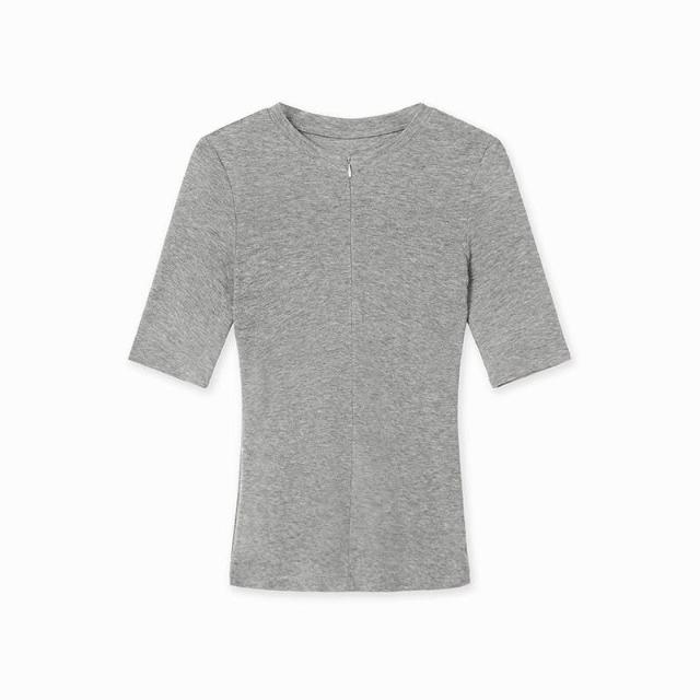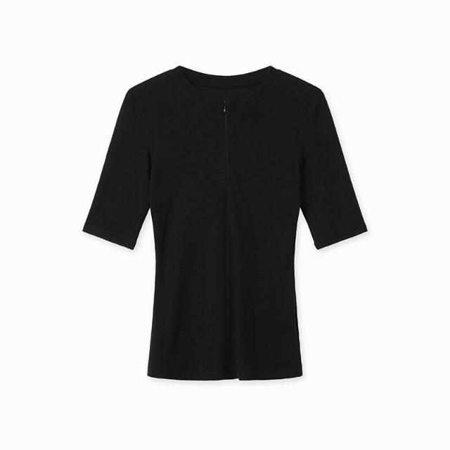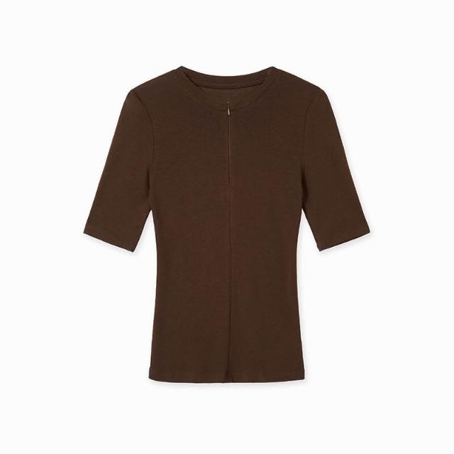 ELSISSI2025秋季天絲休閑風純色拉鏈短袖女t恤修身顯瘦慵懶風上衣 a45