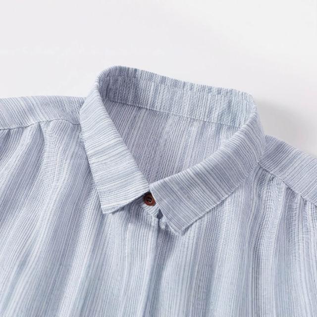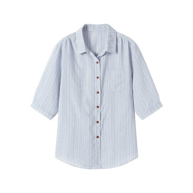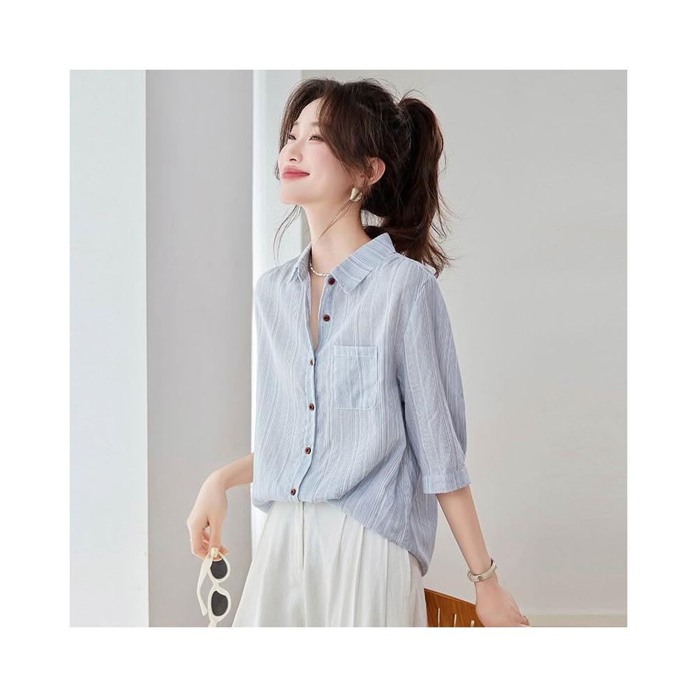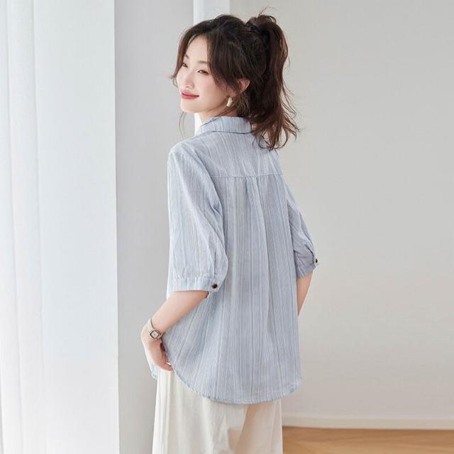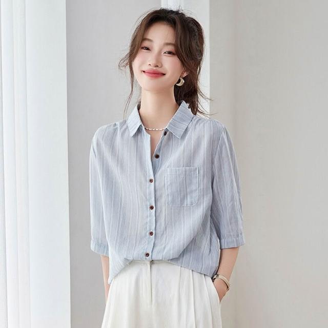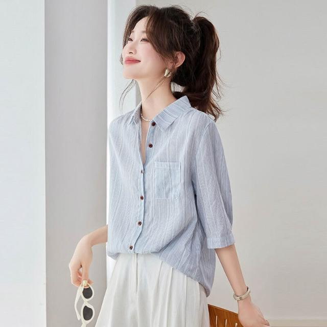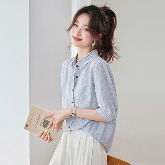 2025夏季新款休閑氣質條紋短袖襯衫女士藍色襯衣寬松中袖上衣小衫 4cf