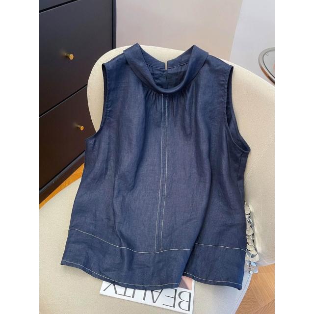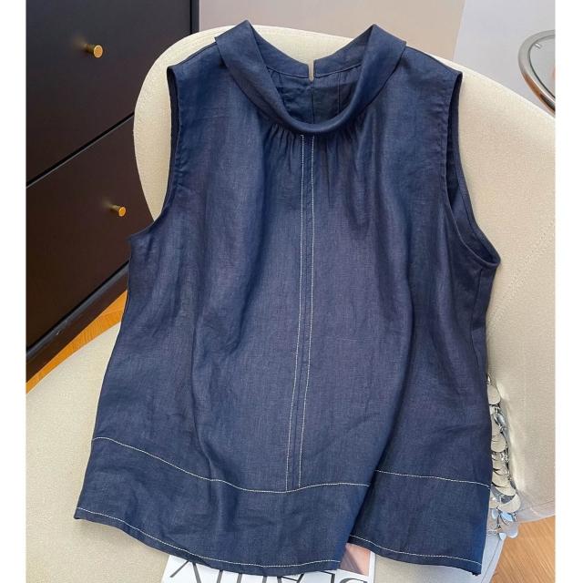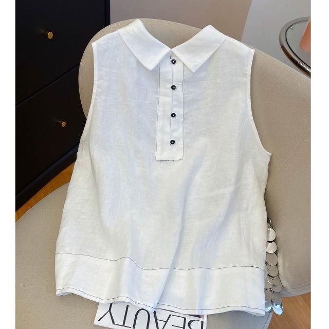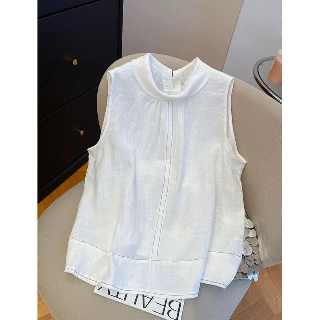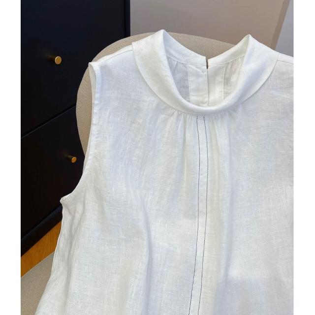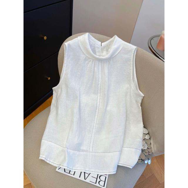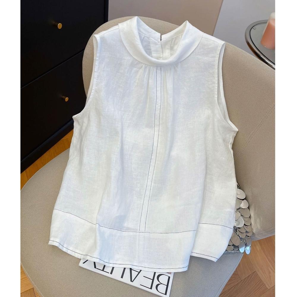高級感白色亞麻無袖立領襯衫女2025夏季新款百搭小眾寬松小衫上衣 014