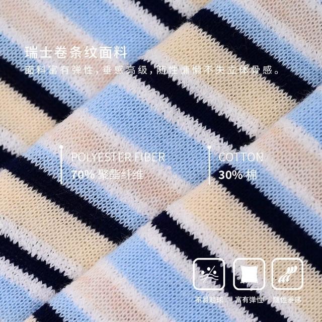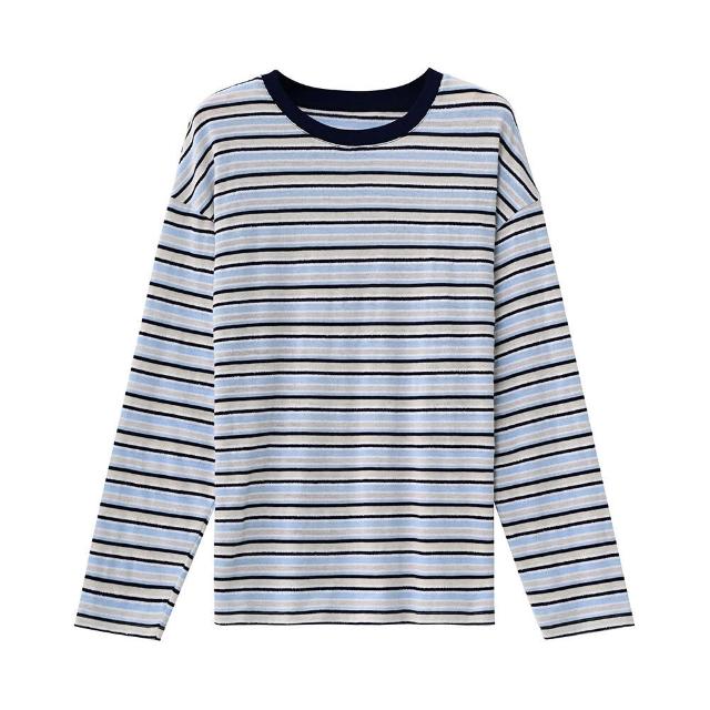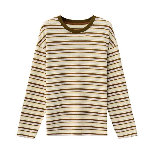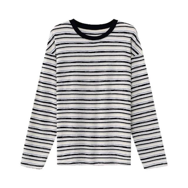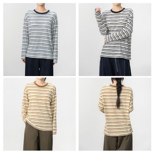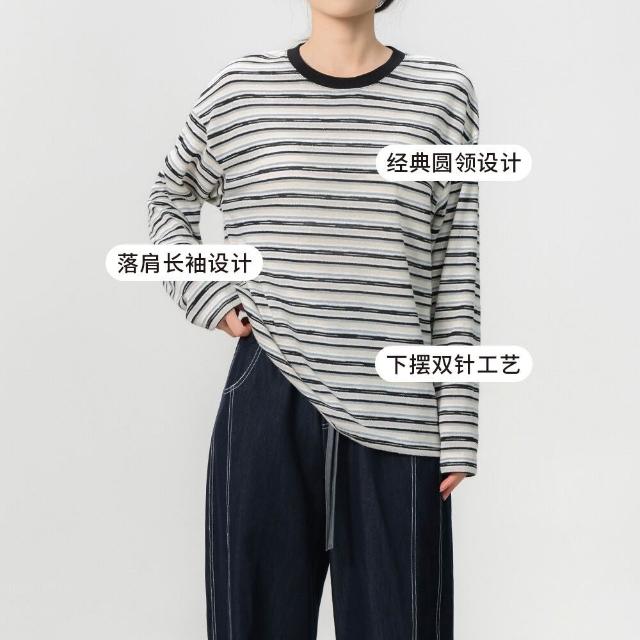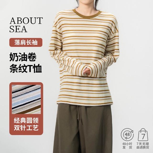 ABOUTSEA秋季風長袖上衣女圓領落肩袖版型寬松慵懶條紋t恤 583