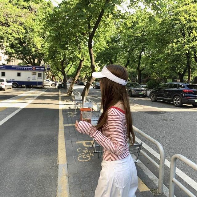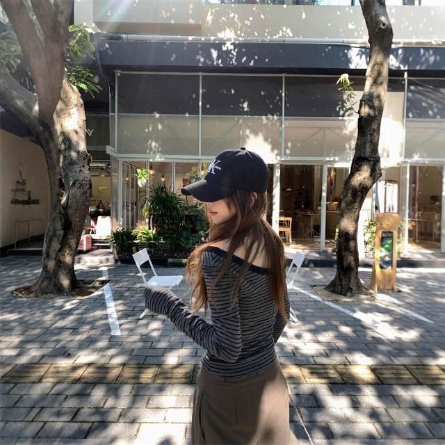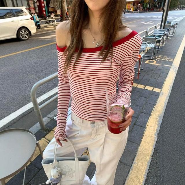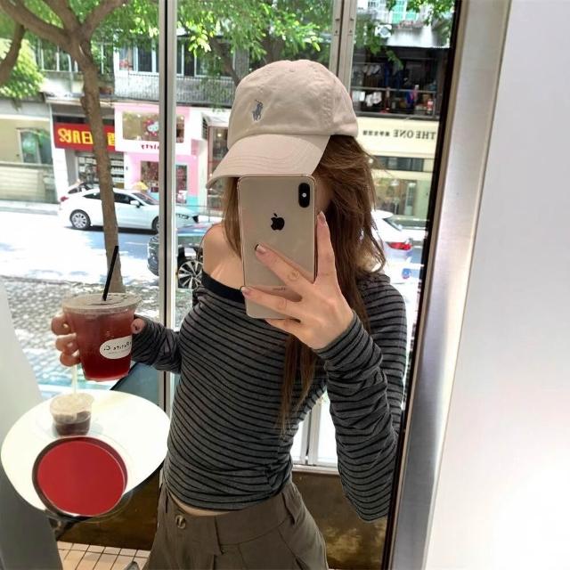 2025早秋新款清涼透氣條紋斜肩長袖T恤女顯瘦修身短款打底衫 a33