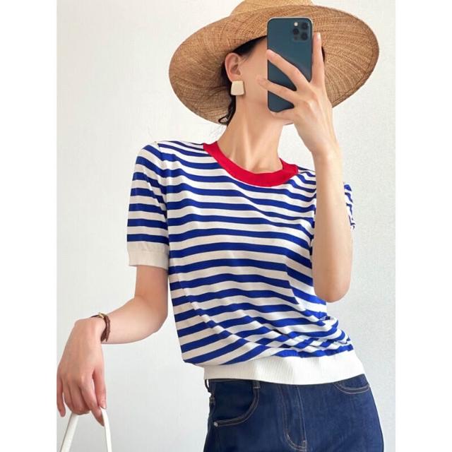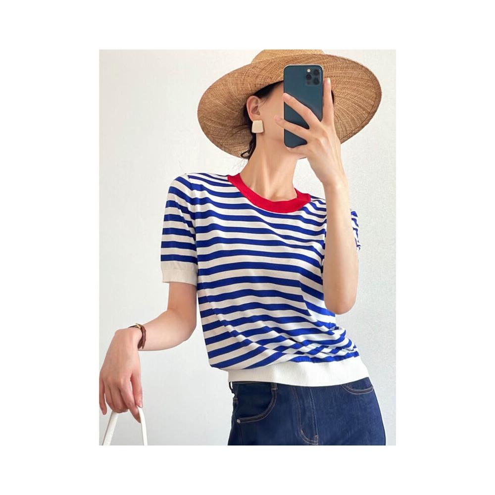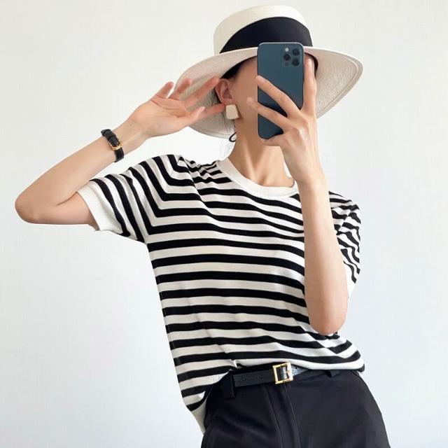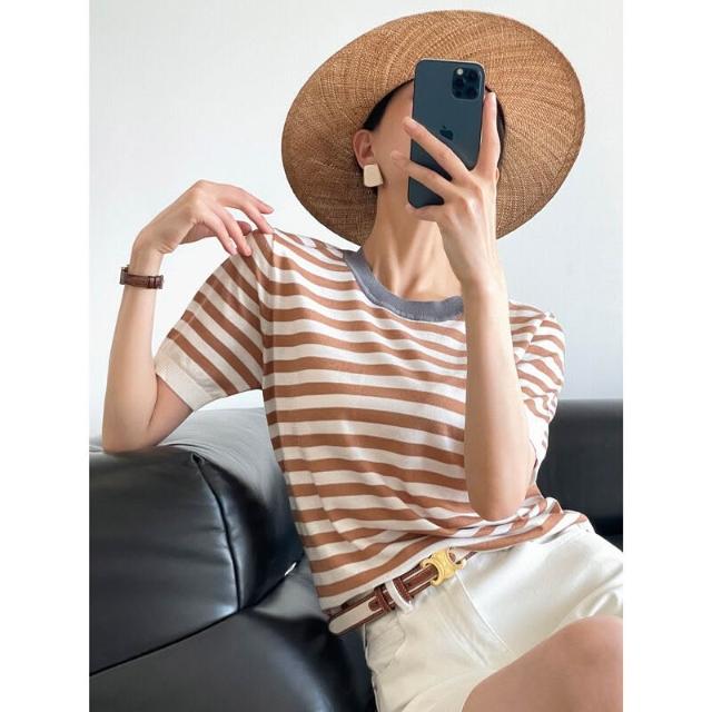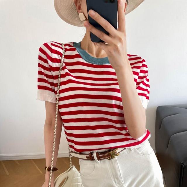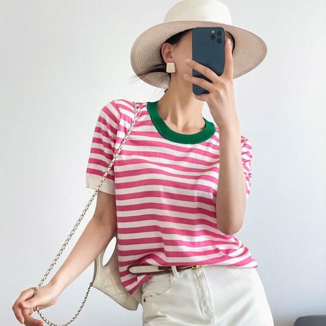 桑蠶絲天絲~條紋撞色多巴胺洋氣圓領短袖針織衫t恤女夏季正肩上衣 3a5f0