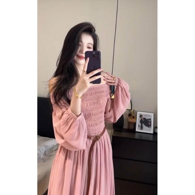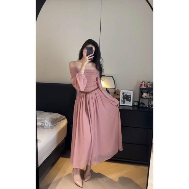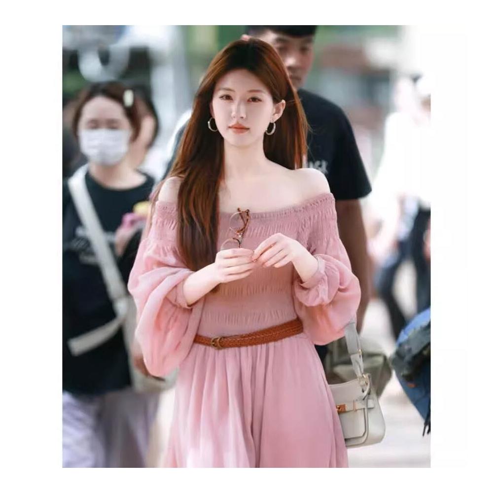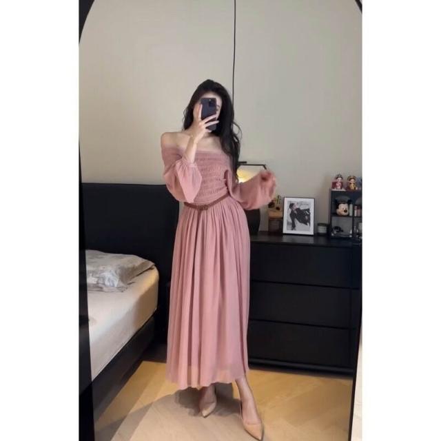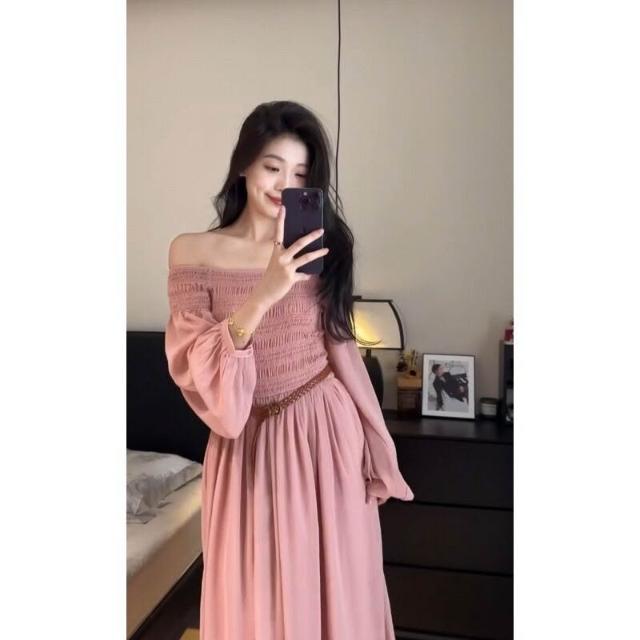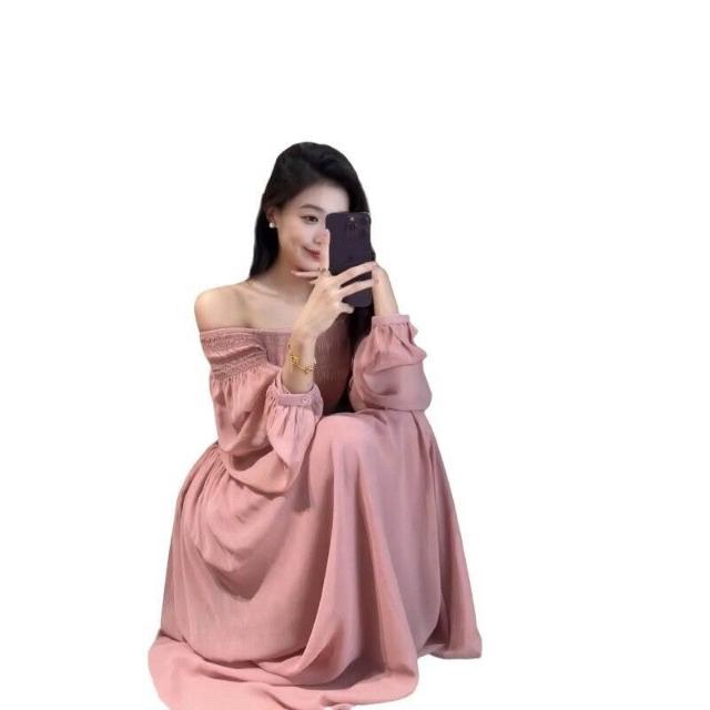 輕氧衣櫥 連衣裙女2025秋季法式一字肩高級感泡泡袖明星粉色長裙