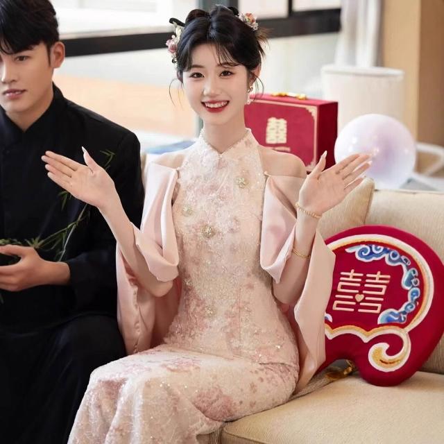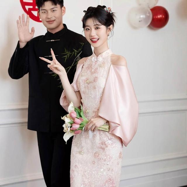 輕氧❤️ 粉色敬酒服 新款新中式 訂婚禮服 新娘結婚宴女 晨袍回門旗袍裙 輕奢 314
