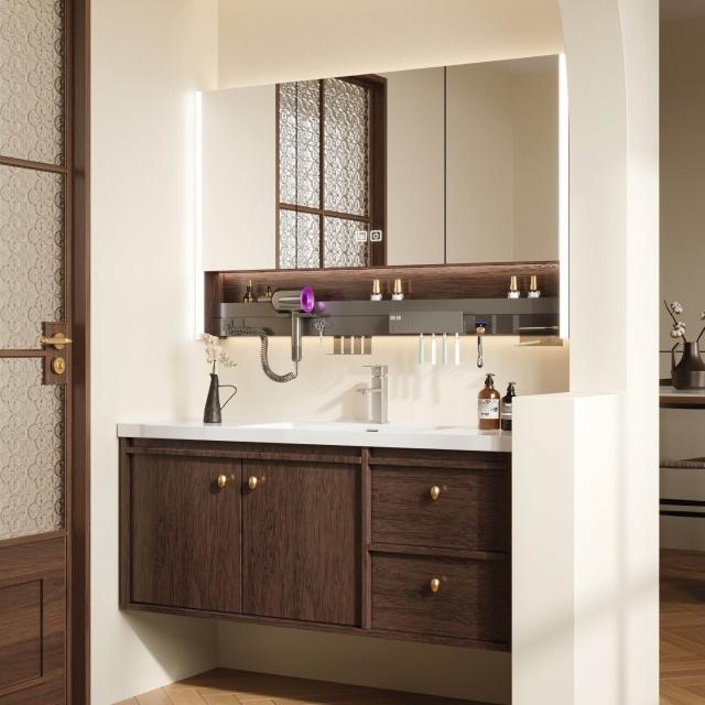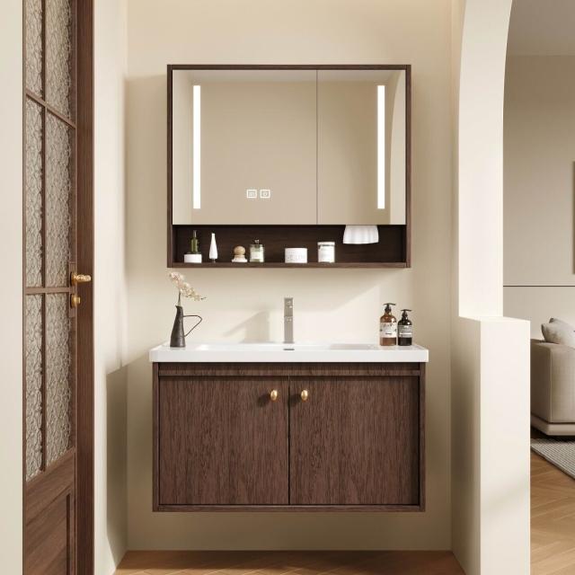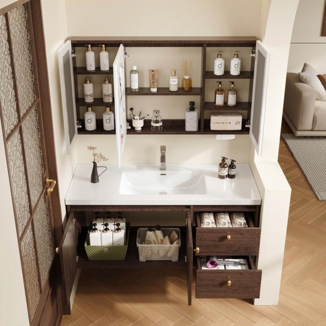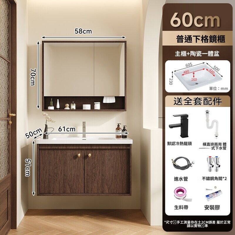輕氧❤️ 中古風蜂窩鋁浴室櫃陶瓷一體盆組合衛生間帶抽屜款胡桃實木洗手臺 dfc