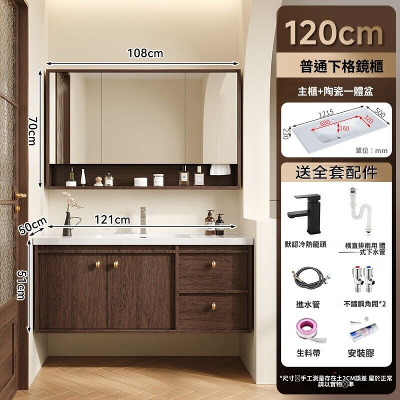 輕氧❤️ 中古風蜂窩鋁浴室櫃陶瓷一體盆組合衛生間帶抽屜款胡桃實木洗手臺 dfc