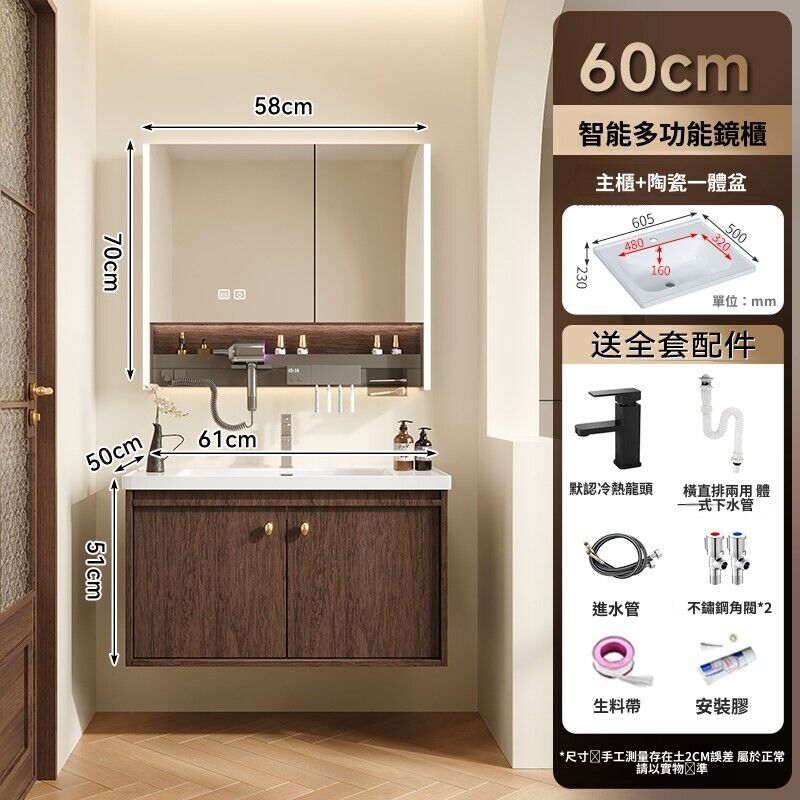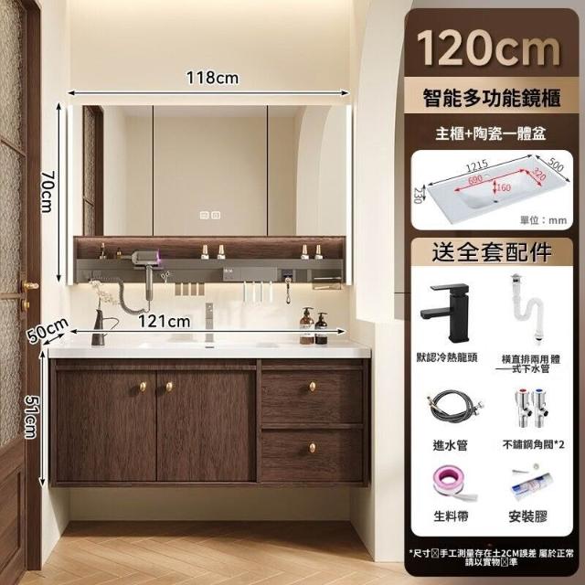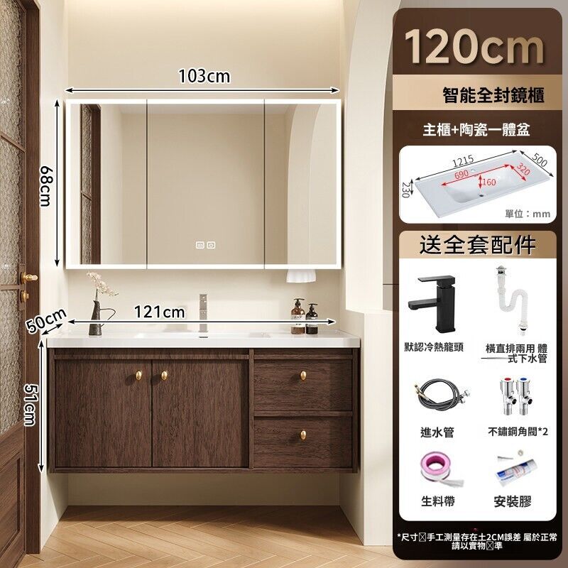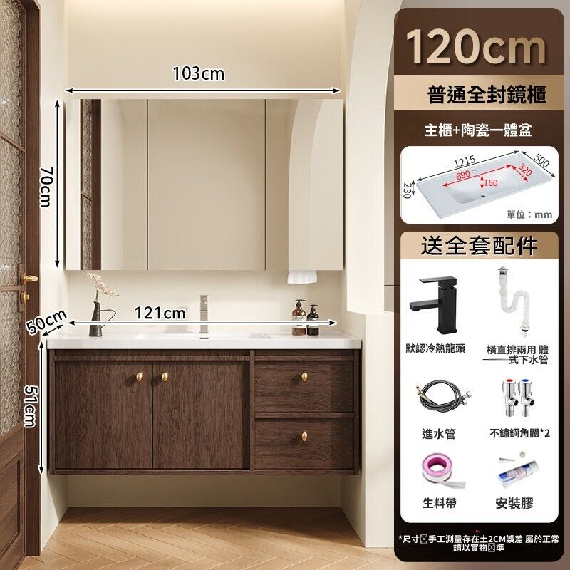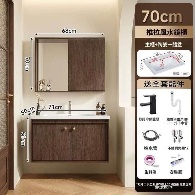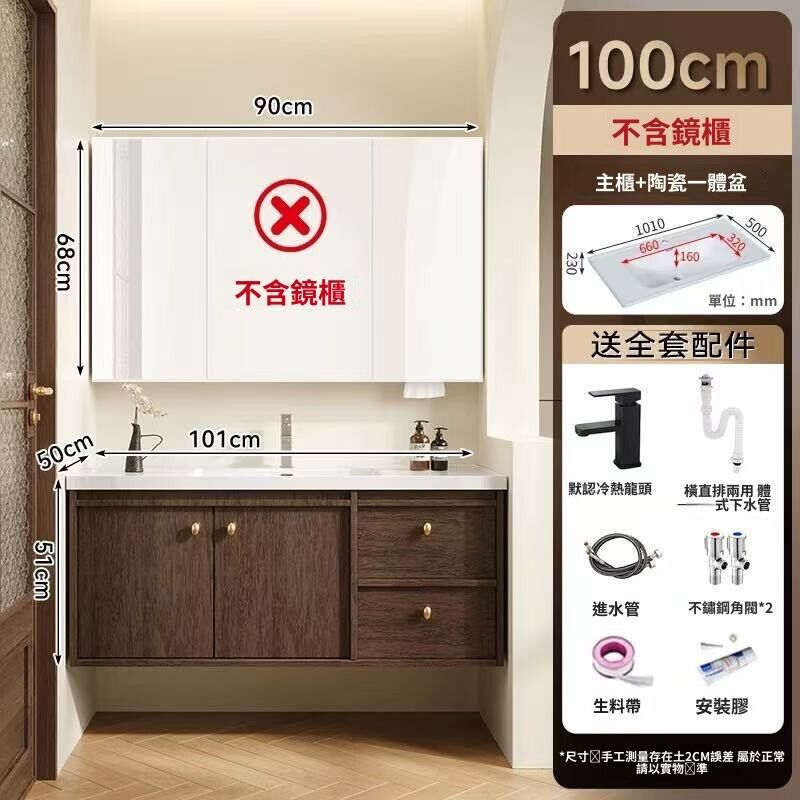 輕氧❤️ 中古風蜂窩鋁浴室櫃陶瓷一體盆組合衛生間帶抽屜款胡桃實木洗手臺 dfc