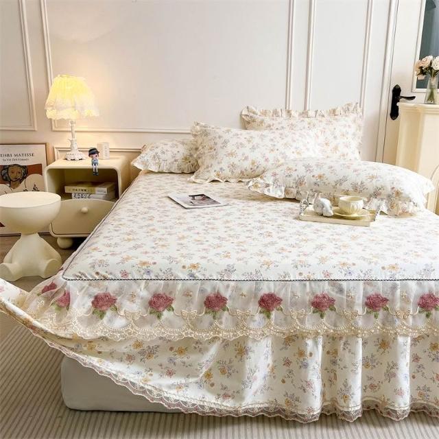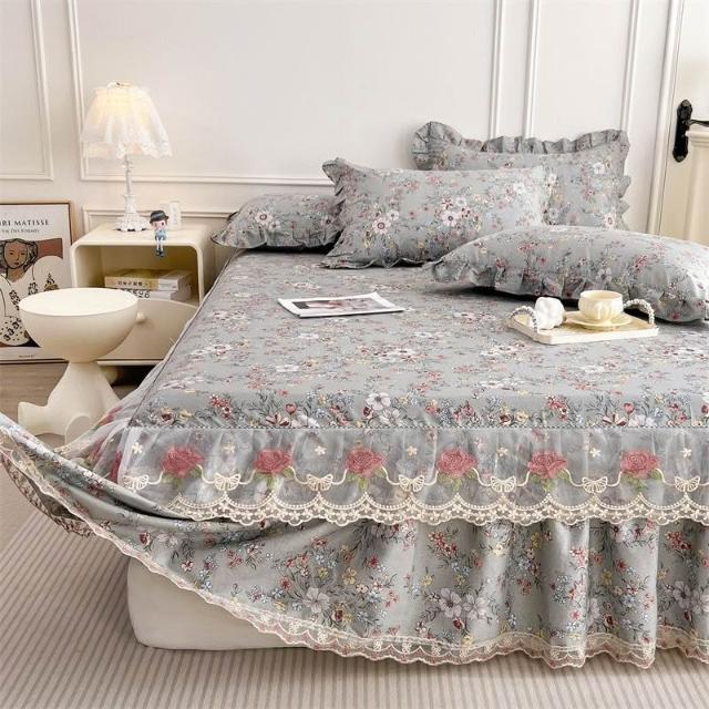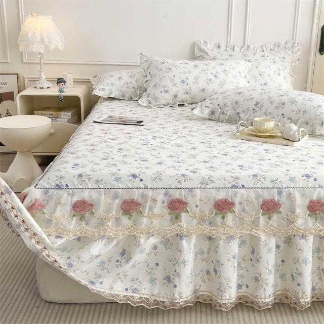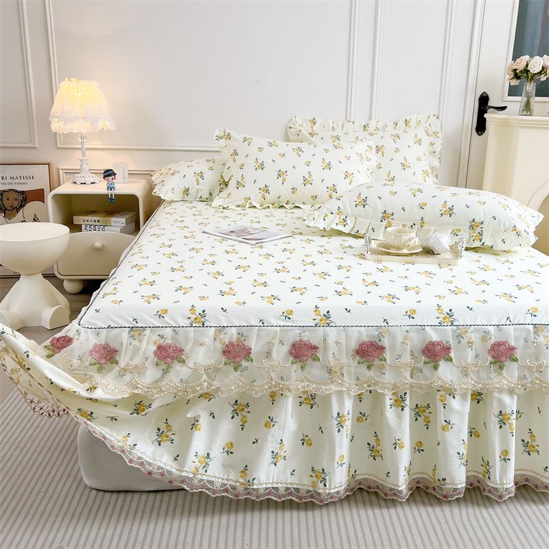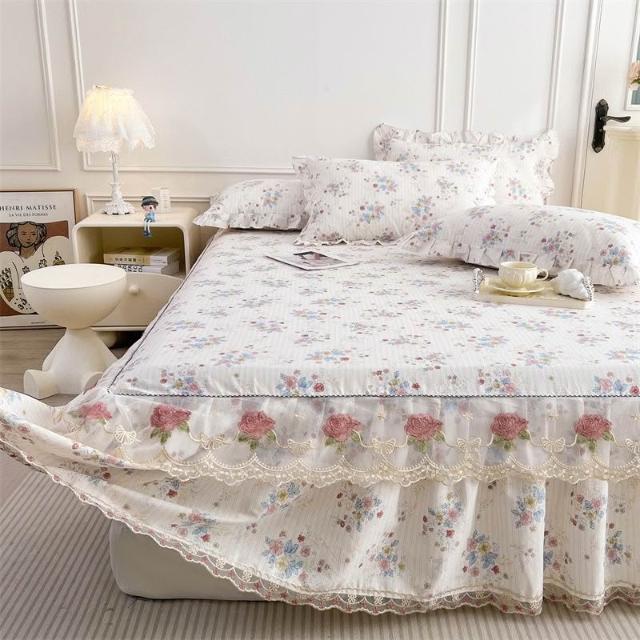 輕氧❤️ 韓版蕾絲花邊公主純棉床裙三件套春秋全棉床罩床墊防滑單件防塵套 1ef