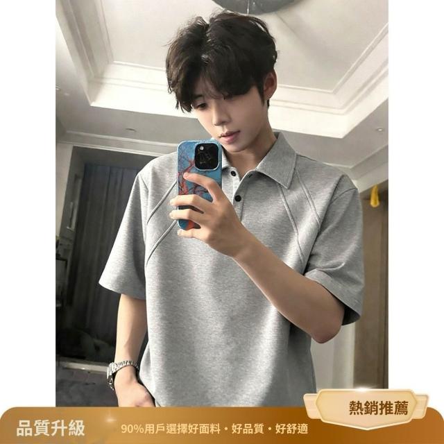 輕氧❤️ 白花灰美式翻領短袖Polo衫男款夏季新款boxy版型t恤高級感半截袖 96a