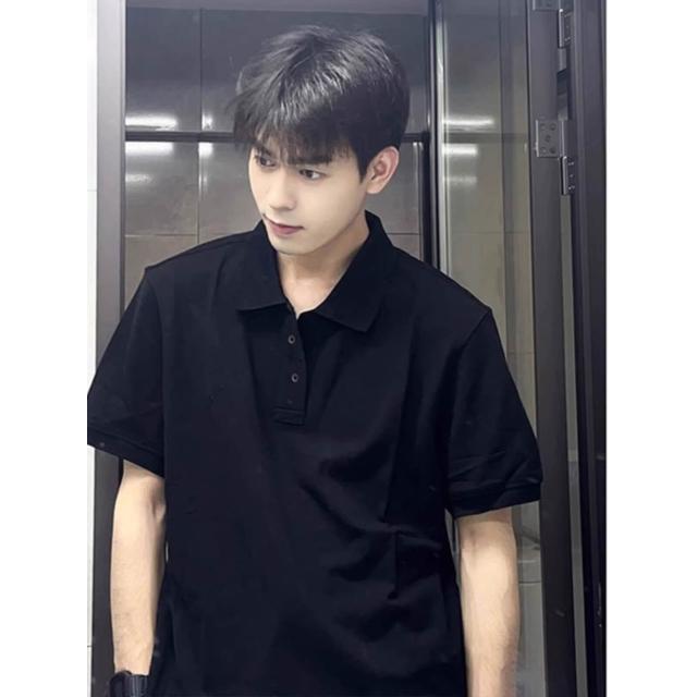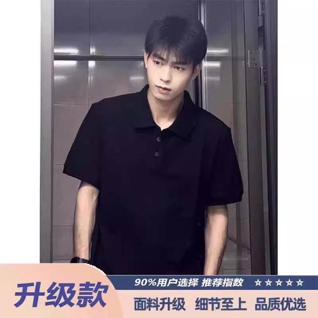 輕氧❤️ 純黑色短袖polo衫男式夏季高級感痞帥翻領t恤美式重磅正肩五分袖 01b