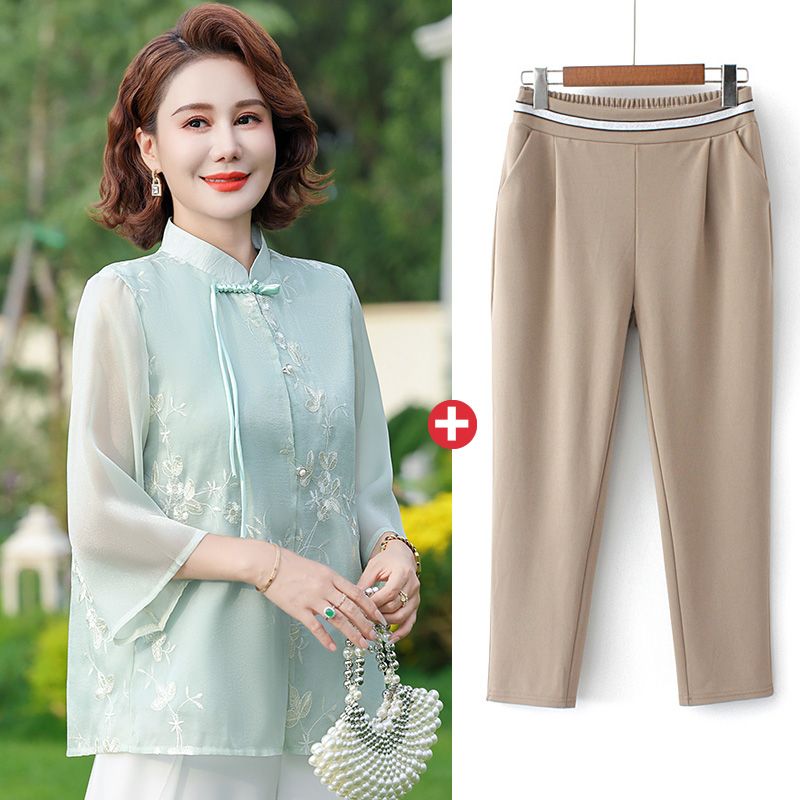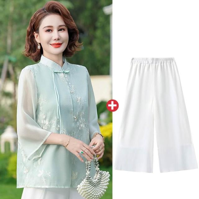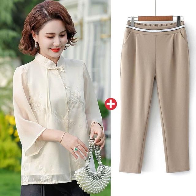輕氧❤️ 年輕媽媽裝中國風雪紡衫七分袖薄款洋氣中老年女裝上衣服刺繡小衫 088