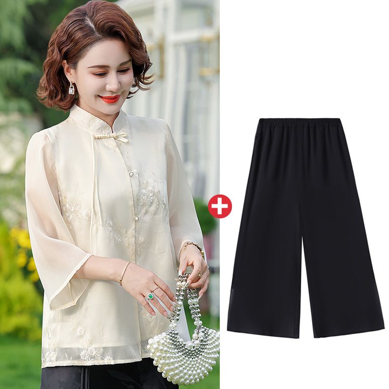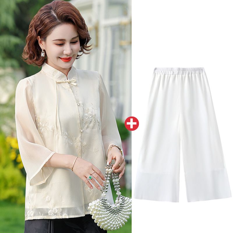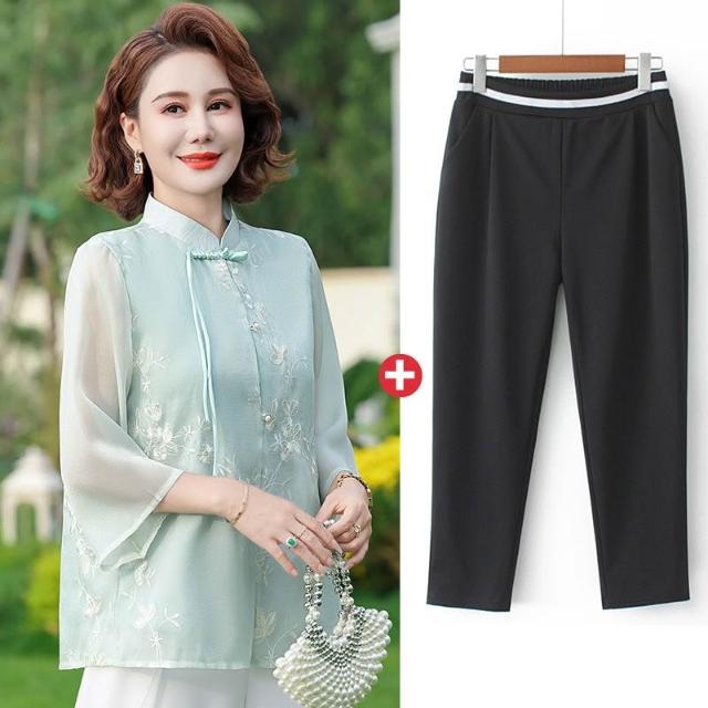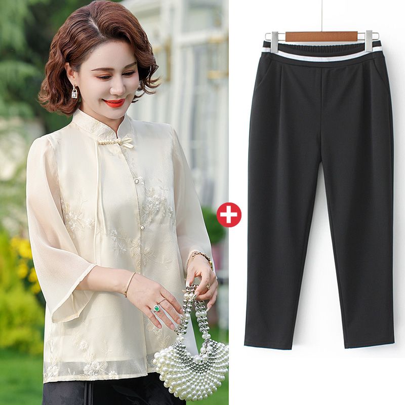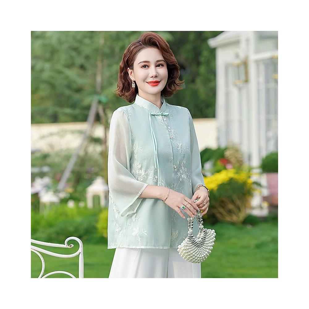 輕氧❤️ 年輕媽媽裝中國風雪紡衫七分袖薄款洋氣中老年女裝上衣服刺繡小衫 088