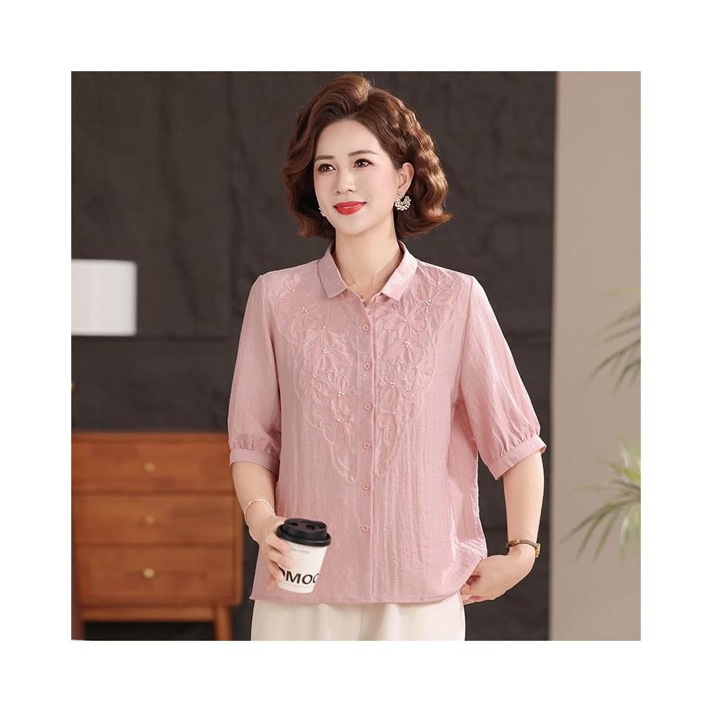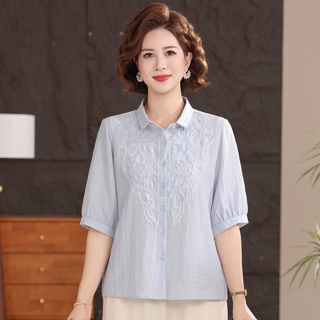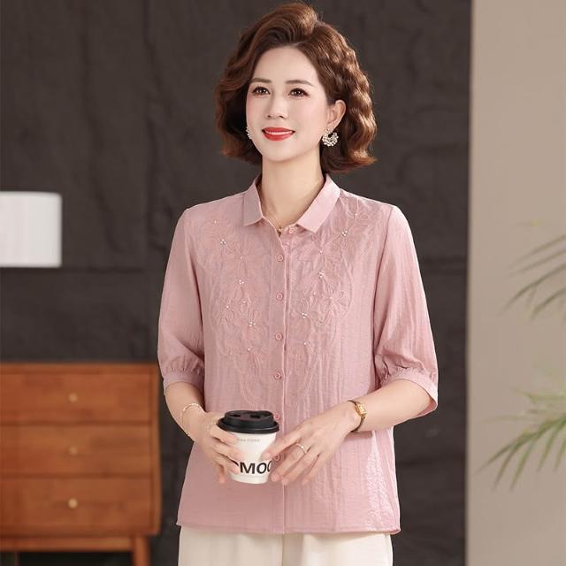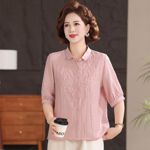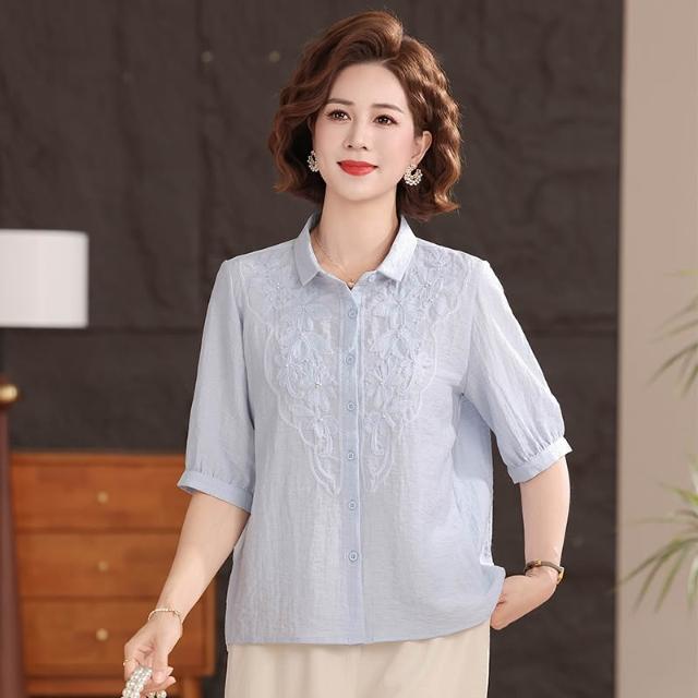 輕氧❤️ 母親節中年媽媽女襯衫夏季薄款中袖襯衣高端純色休閑翻領棉麻上衣 2e4