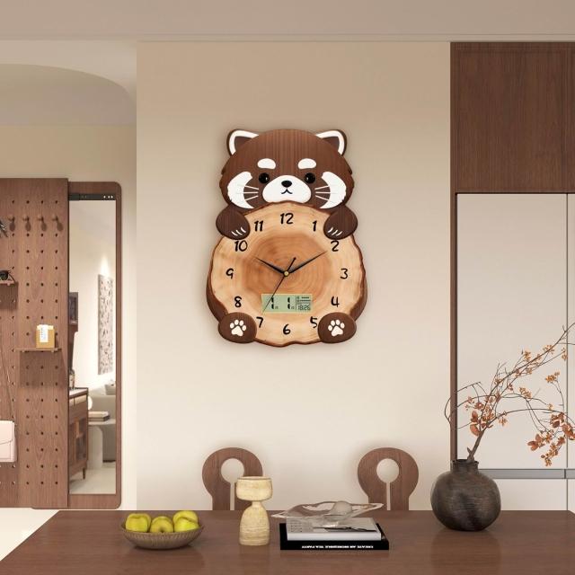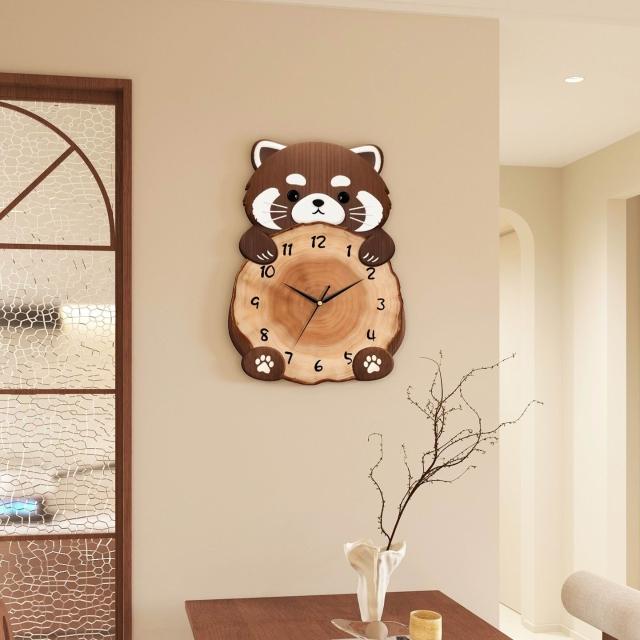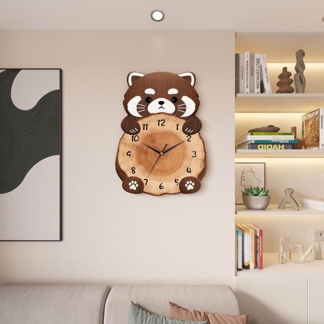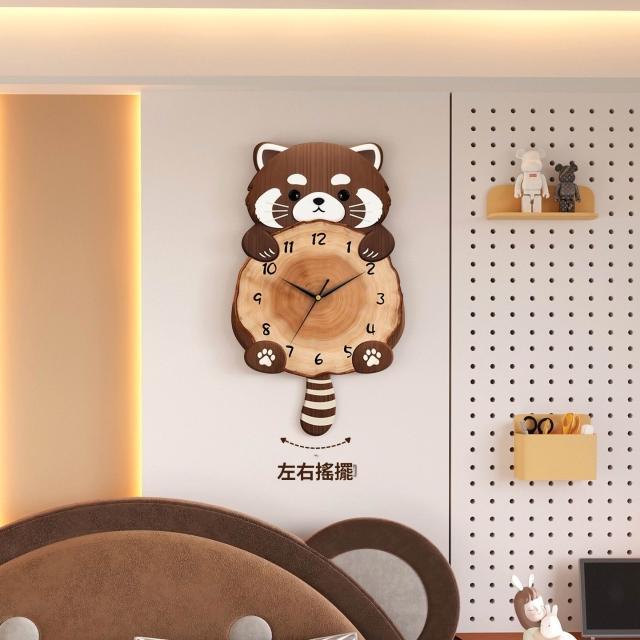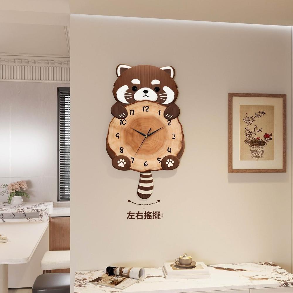 輕氧 卡通免打孔小熊尾巴搖擺石英鐘表掛墻客廳新款掛鐘家用創意木紋鐘 75a