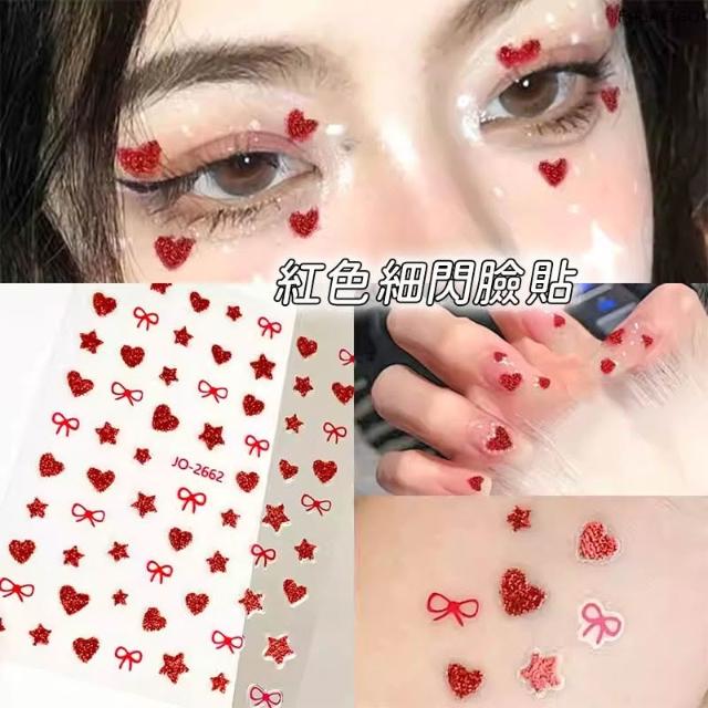 『天天秒發』 妝容貼紙 臉貼 彩妝貼紙 細閃貼紙 美甲貼紙紅色愛心貼紙跨年妝臉上飾品臉部化妝舞台蝴蝶結貼鑽音樂節派對