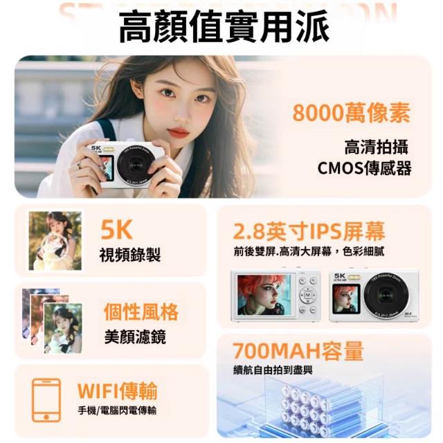 隔日到貨前後雙屏自拍神器8000萬畫質高清CCD相機★5K錄影+19種美顏濾鏡| 延時抓拍 Vlog 送禮必買