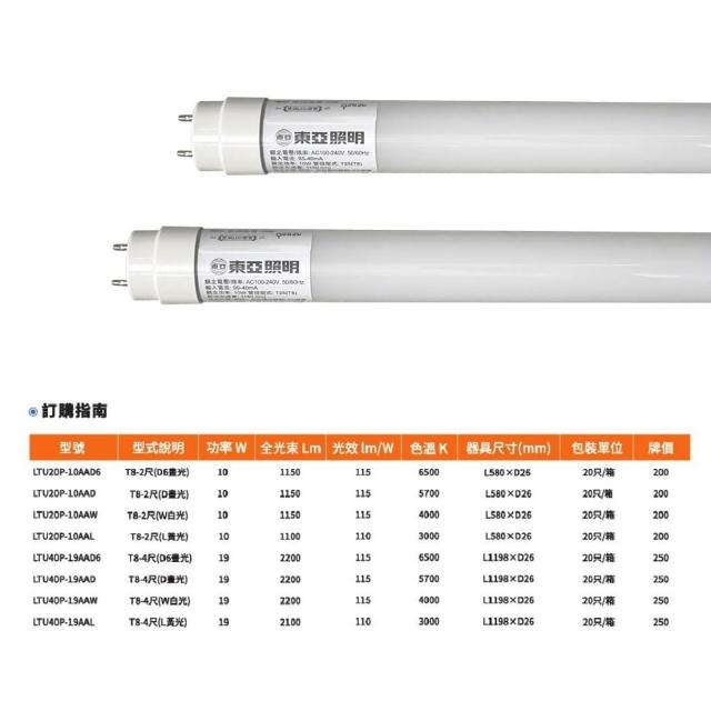 東亞照明 LED燈管 4尺 2尺 19W 10W T8燈管 玻璃燈管 LED T8燈管 白光 自然光 黃光
