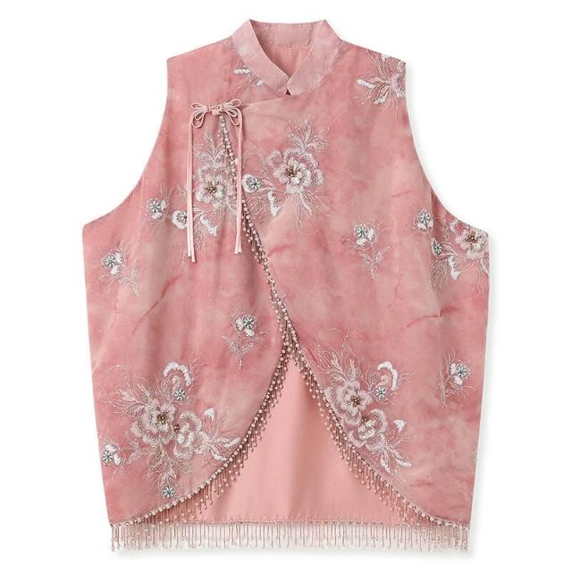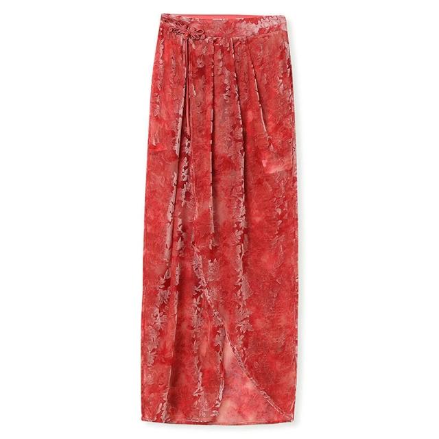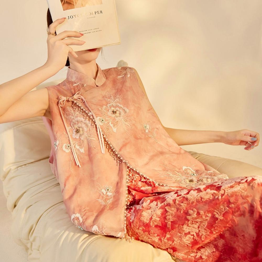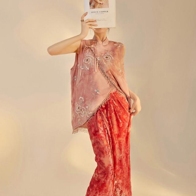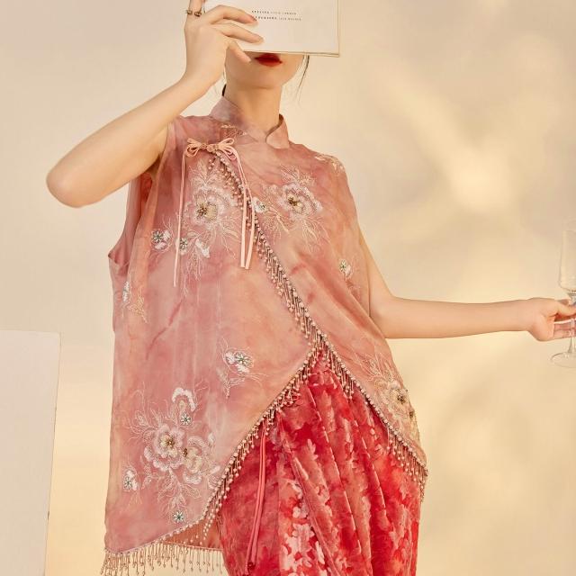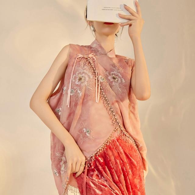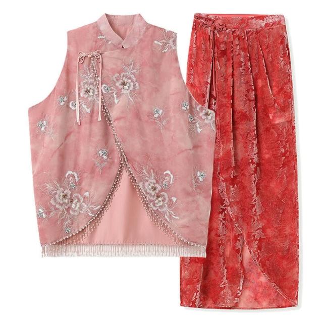 歐萊 早秋新款新中式國風女裝重工立領背心絲絨開衩半裙馬甲套裝