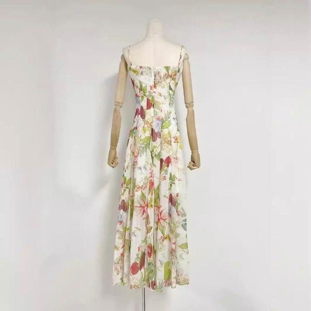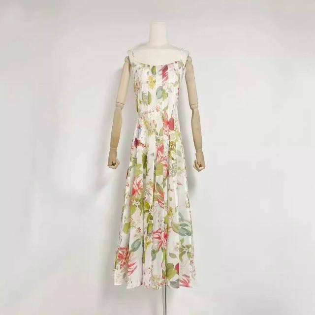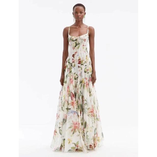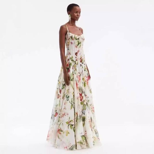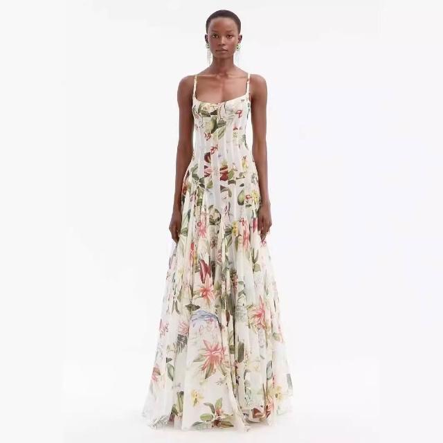 歐萊 澳洲小眾2025夏季新款吊帶U領 無袖印花收腰镂空長款連衣裙女